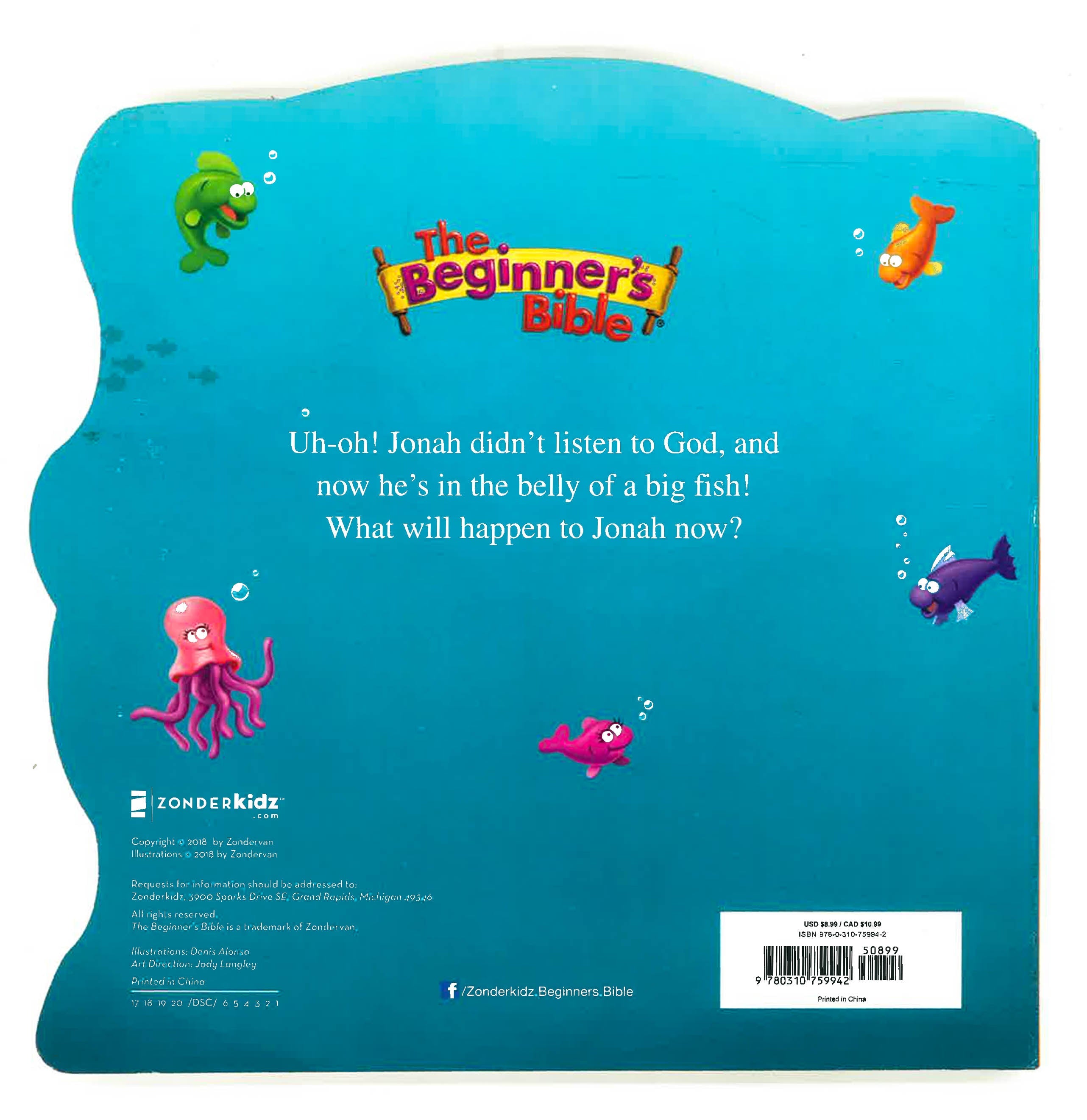 The Beginner's Bible (R) has been a favorite with young children and their parents since its release in 1989 with over 25 million products sold.Uh-oh! Jonah didn't listen to God, and now he's in the belly of a big fish! What will happen to Jonah next? This retelling of the story of Jonah and the fish will teach children about obeying God and God's forgiveness. Featuring vibrant, 3D art from the beloved The Beginner's Bible and a die-cut format, this board book is perfect for parents to share with their children.