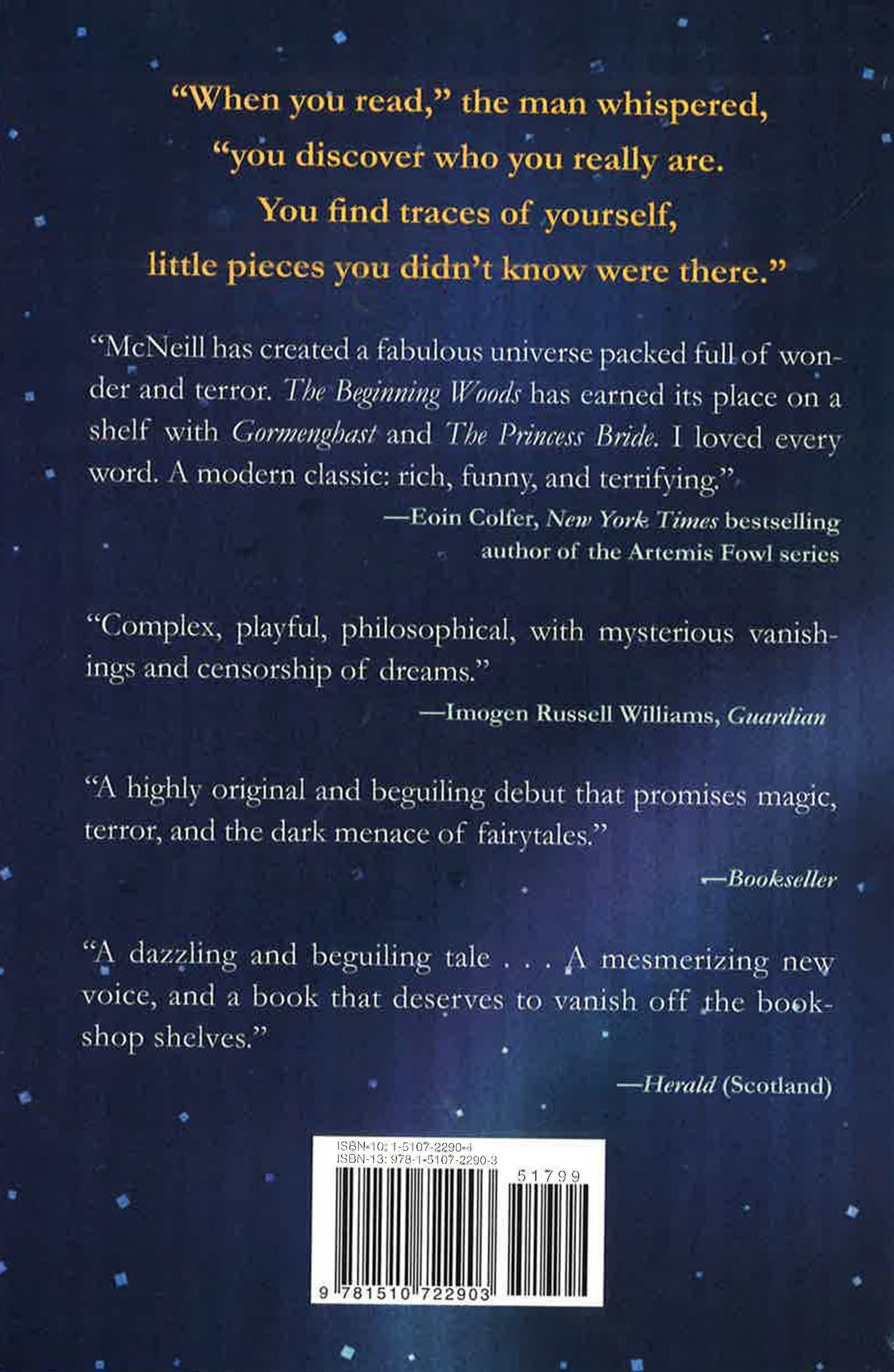 A MYSTERY NO ONE CAN SOLVE The Vanishings started without warning. People disappearing into thin air--just piles of clothes left behind. Each day, thousands gone without a trace. A BABY NO ONE WANTED Abandoned in a bookshop, Max has grown up haunted by memories of his parents. Only he can solve the mystery of the Vanishings. A SECRET THAT COULD SAVE THE FUTURE To find the answers, Max must leave this world and enter the Beginning Woods, a realm of magic and terror where stories are all too real. A STORY THAT WILL TAKE YOU TO ANOTHER WORLD Greater than your dreams. Darker than your fears. Full of more wonder than you could ever desire. Welcome to the ineffable Beginning Woods. . . .