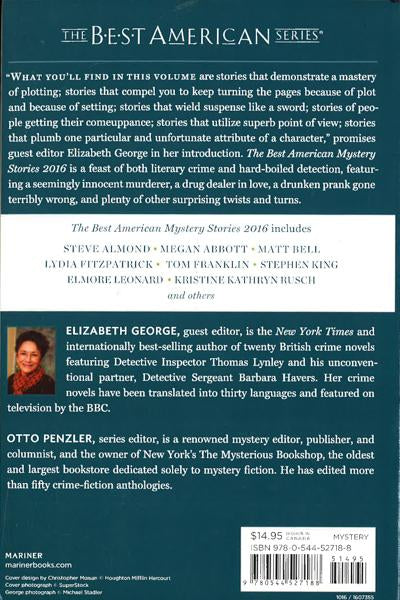 What you'll find in this volume are stories that demonstrate a mastery of plotting; stories that compel you to keep turning the pages because of plot and because of setting; stories that wield suspense like a sword; stories of people getting their comeuppance; stories that utilize superb point of view; stories that plumb one particular and unfortunate attribute of a character," promises guest editor Elizabeth George in her introduction. The Best American Mystery Stories 2016 is a feast of both literary crime and hard-boiled detection, featuring a seemingly innocent murderer, a drug dealer in love, a drunken prank gone terribly wrong, and plenty of other surprising twists and turns. The Best American Mystery Stories 2016 includes STEVE ALMOND, MEGAN ABBOTT, MATT BELL, LYDIA FITZPATRICK, TOM FRANKLIN, STEPHEN KING, ELMORE LEONARD, KRISTINE KATHRYN RUSCH and others ELIZABETH GEORGE, guest editor, is the New York Times and internationally best-selling author of twenty British crime novels featuring Detective Inspector Thomas Lynley and his unconventional partner, Detective Sergeant Barbara Havers. Her crime novels have been translated into thirty languages and featured on television by the BBC. OTTO PENZLER, series editor, is a renowned mystery editor, publisher, columnist, and owner of New York's The Mysterious Bookshop, the oldest and largest bookstores solely dedicated to mystery fiction. He has edited more than fifty crime-fiction anthologies.