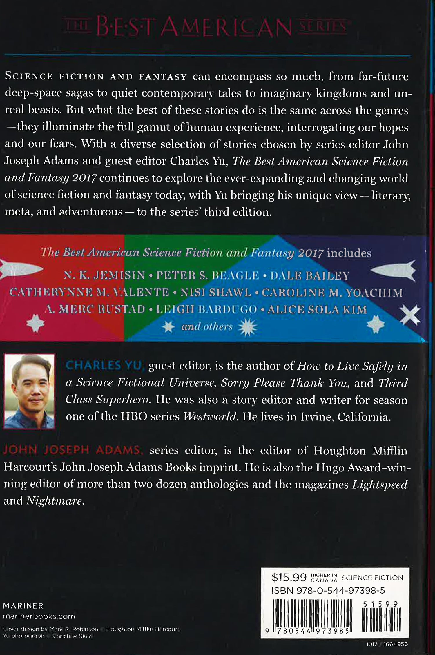 This volume showcases the nuanced, playful, ever-expanding definitions of the genre and celebrates its current renaissance." --Washington Post Science fiction and fantasy can encompass so much, from far-future deep-space sagas to quiet contemporary tales to unreal kingdoms and beasts. But what the best of these stories do is the same across the genres--they illuminate the whole gamut of the human experience, interrogating our hopes and our fears. With a diverse selection of stories chosen by series editor John Joseph Adams and guest editor Charles Yu, The Best American Science Fiction and Fantasy 2017 continues to explore the ever-expanding and changing world of SFF today, with Yu bringing his unique view--literary, meta, and adventurous--to the series' third edition. *This book may have remainder mark*