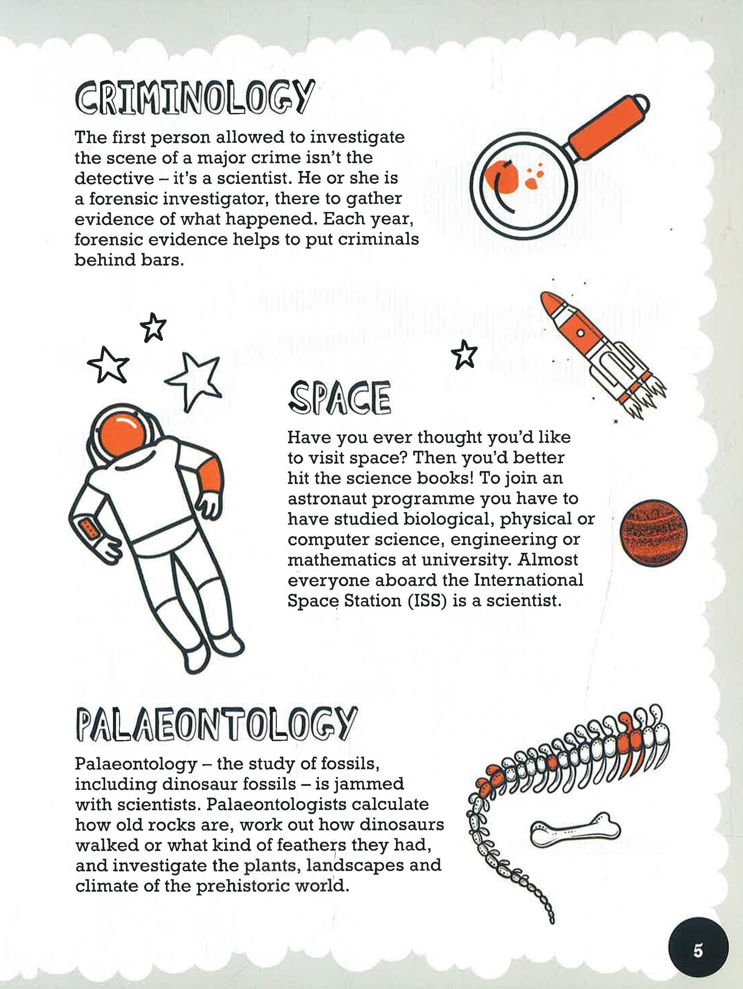 Does your child dream of a future career be in the exciting world of science? This book will show them that there is so much more to a science career than peering at bacteria through a microscope. The perfect book for budding astronauts, crime scene investigators, brain surgeons, particle physicists or even volcanologists. This book highlights the importance of studying STEAM subjects at school to open up the route into these professions. There are lots of careers that use science in one way or another and this book will open their eyes and mind to the possibilities that science can bring. Famous and leading scientists in their fields are featured throughout. Readers will also go behind the scenes with crime scene investigators, palaeontologists, scientific photographers, food scientists and the particle physicists at CERN to discover more about how these professionals do their jobs.