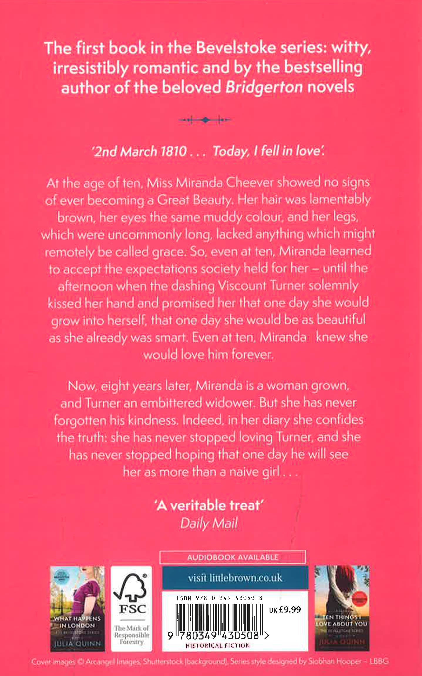 At the age of ten, Miss Miranda Cheever showed no signs of ever becoming a Great Beauty. Her hair was lamentably brown, her eyes the same muddy colour, and her legs, which were uncommonly long, lacked anything which might remotely be called grace. So, even at ten, Miranda learned to accept the expectations society held for her - until the afternoon when the handsome and dashing Viscount Turner solemnly kissed her hand and promised her that one day she would grow into herself, that one day she would be as beautiful as she already was smart. Even at ten, Miranda knew she would love him forever.