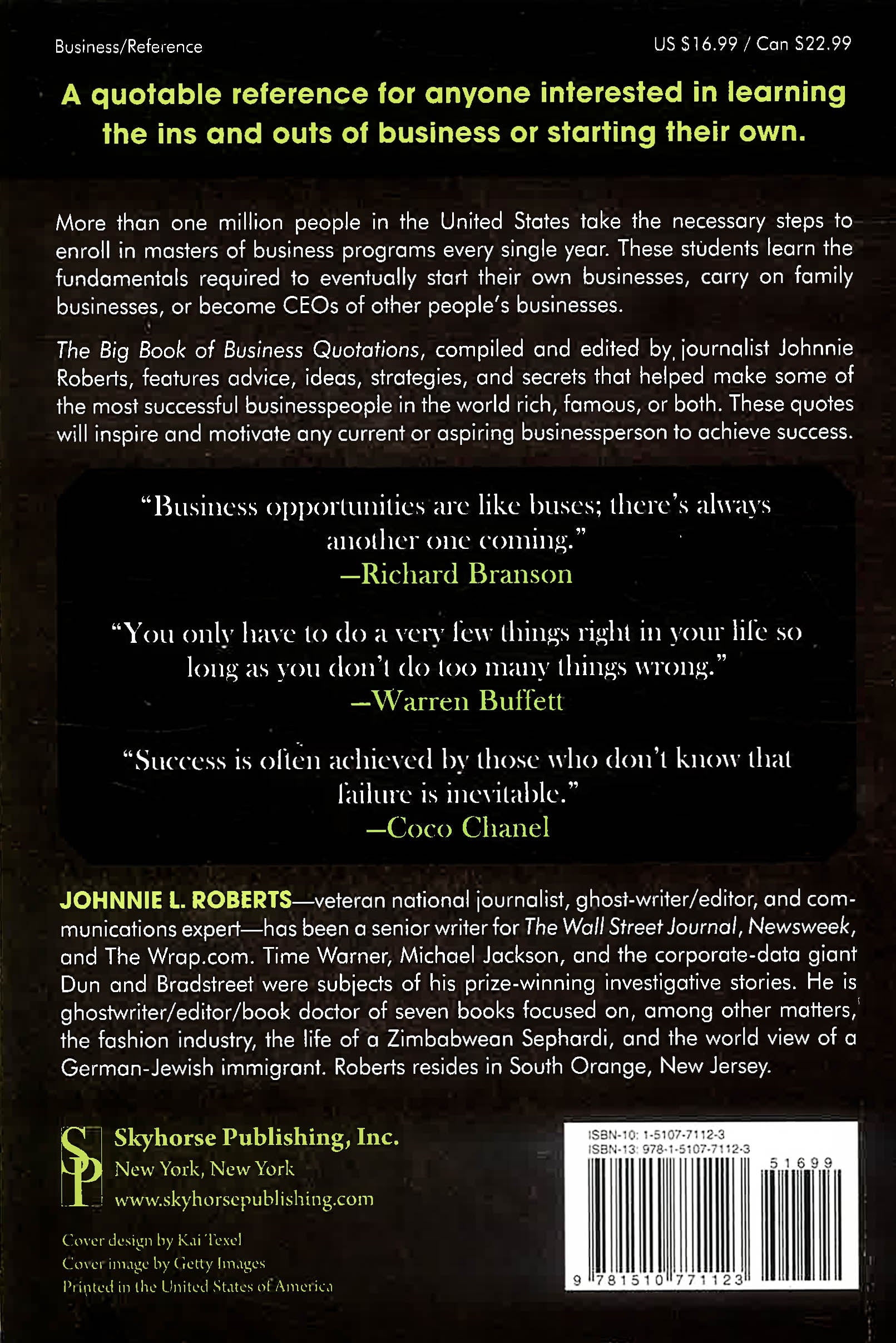 The Big Book of Business Quotations, compiled and edited by journalist Johnnie Roberts, features advice, ideas, strategies, and secrets that helped make some of the most successful businesspeople in the world rich, famous, or both. These quotes will inspire and motivate any current or aspiring businessperson to achieve success.