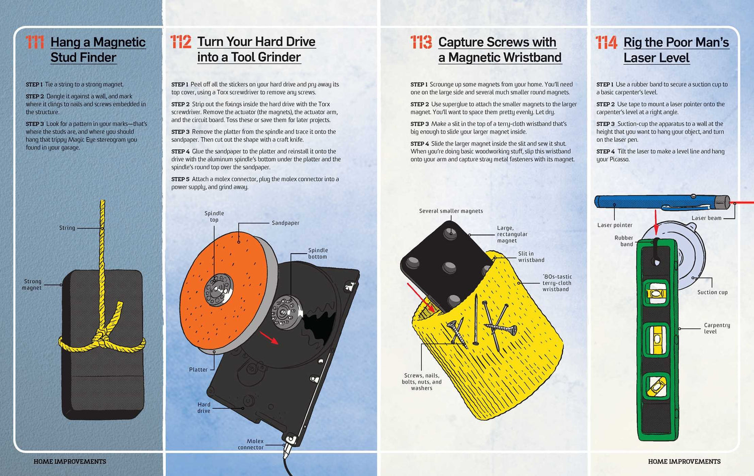 GADGET UPGRADES Want to use an XBOX 360 controller as a phone case or build a polygraph test? Looking to brighten up a standard flashlight or charge your phone with solar rays? Improvise a fisheye lens for your camera or dye your laptop? Now you can upgrade many household items without breaking the bank. Look for updated content, such as a hacked radio that lets you listen to meteor showers, your very own DIY particle detector, and a cool soldering stencil.