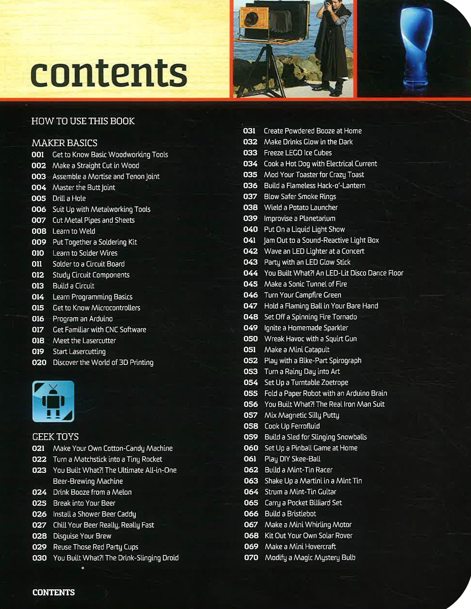 GEEK TOYS Be the life of the party with quirky drinking amusements, amazing pyrotechnics, and robots. Includes projects for installing a shower beer caddy, freezing LEGO ice cubes, wielding a potato launcher, building an LED-light dance floor, and constructing a light saber, with updates like a sword that detects free Wi-Fi, a solar-powered rover that really goes, a replica of a Roman catapult, and more!