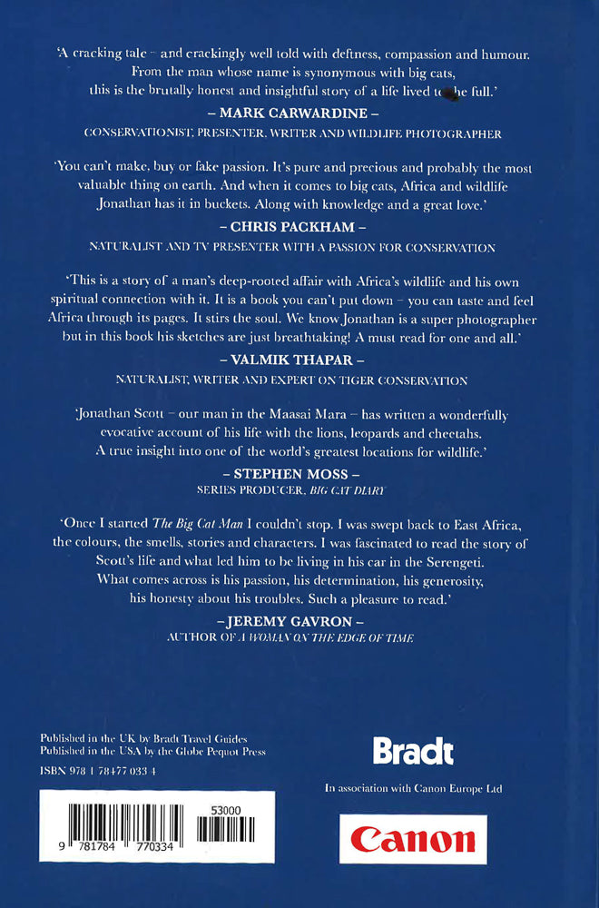 The Big Cat Man - wildlife autobiography of Jonathan Scott, holiday reads and travel literature, including the BBC's Big Cat Diary, Paramount's Wild Things, and Elephant Diaries. Also included are photographs and illustrations by Jonathan and Angela Scott, plus coverage of the Maasai Mara and Serengeti, Antarctica, and travels to India and Bhutan.This new autobiography by wildlife celebrity Jonathan Scott celebrates the extraordinary life of one of the world's most popular wildlife presenters and photographers. From his childhood on a Berkshire farm in the UK to his rise to international fame as a presenter on the Big Cat Diary, one of the BBC Natural History Unit's most popular and long-running wildlife series, Jonathan Scott has lived a life that many people can only dream about. Following a degree in Zoology he travels 6,000 miles overland to Africa, where he becomes first a wildlife artist and then a safari guide in the Maasai Mara. His experience allows him to write his first major book The Marsh Lions, followed by The Leopard's Tale. At the same time, his TV career is launched when he becomes a presenter on the long-running American series Wild Kingdom. Over the years Jonathan's observations of wildlife prompt him to reflect on his own life, revealing a side to his character that he has struggled to overcome since childhood. Aged nearly forty, he finally finds peace through meeting and marrying his wife, Angela, and together with her two children they go on to prove you can mix domestic life and an adventurous career when you share a love of family and wilderness, art and photography. From their base in Kenya Jonathan and Angela travel to Antarctica, a continent which grips them no less than their adopted homeland, followed in later years by travels to India and Bhutan. Throughout, the call of Africa always draws them home, but Africa and the rest of the world are under siege from the tide of humanity that threatens to snuff out the last wild places. Having travelled the globe in search of award-winning photographs and lived a life of adventure, Jonathan and Angie find their world changes forever the day she is diagnosed with a cranial aneurism requiring urgent brain surgery. Facing up to that challenge draws them even closer together and forces them to examine the meaning of life, leading them on a spiritual journey to rival anything they have undertaken before. Ultimately, The Big Cat Man is a love story: one man's infatuation with Africa and his unfailing devotion to the woman who shares his passion. Jonathan's writing makes for a fascinating safari through a life lived in the world's most spectacular wilderness area. His book raises uncomfortable questions about the future of wildlife on a continent where the needs of the people sometimes seem overwhelming; it will bring hope to those who have struggled with their own demons and been afraid to seek help; but most of all it will be an inspiration for those who, like Jonathan and Angie, long to follow their dream, whatever it may be.