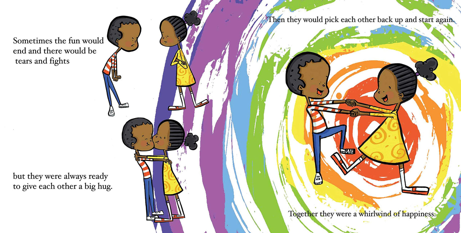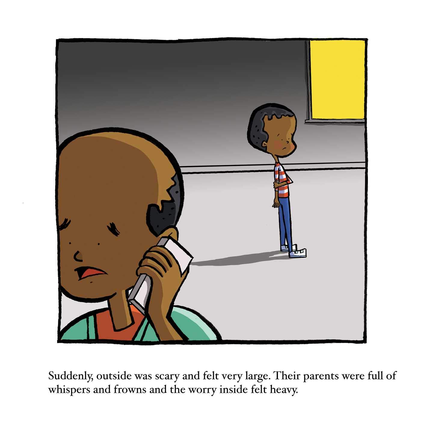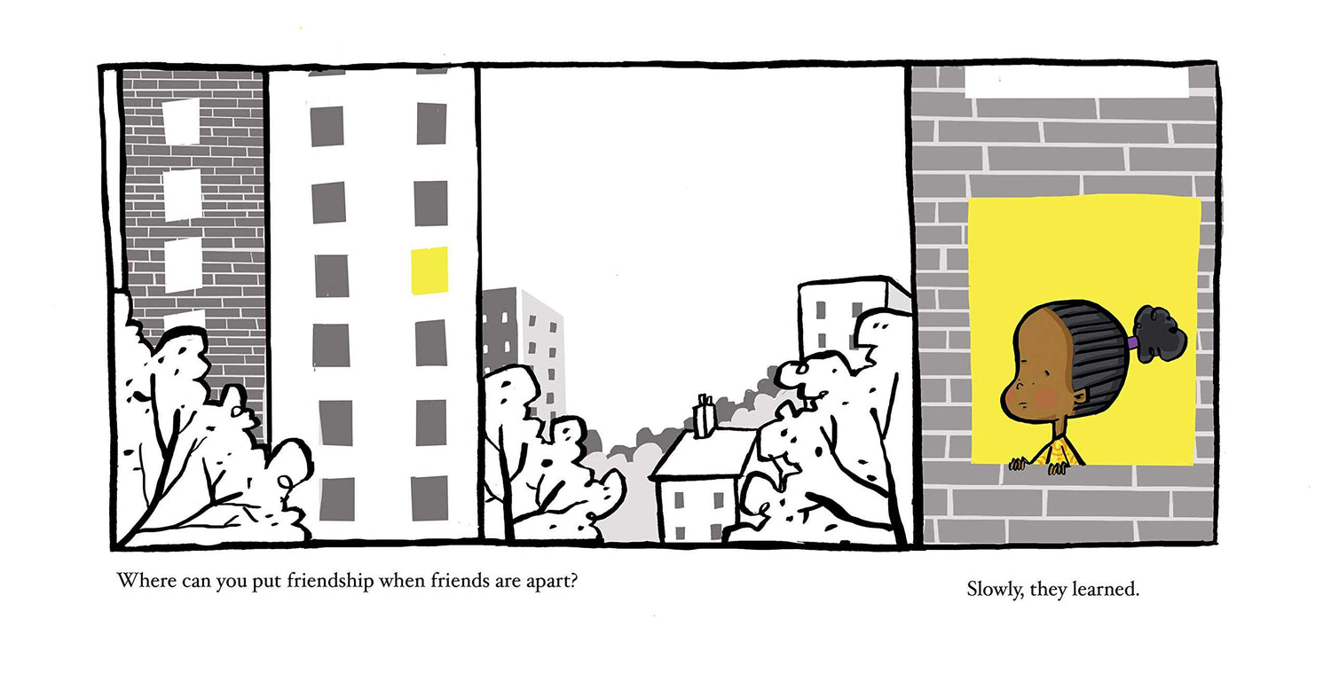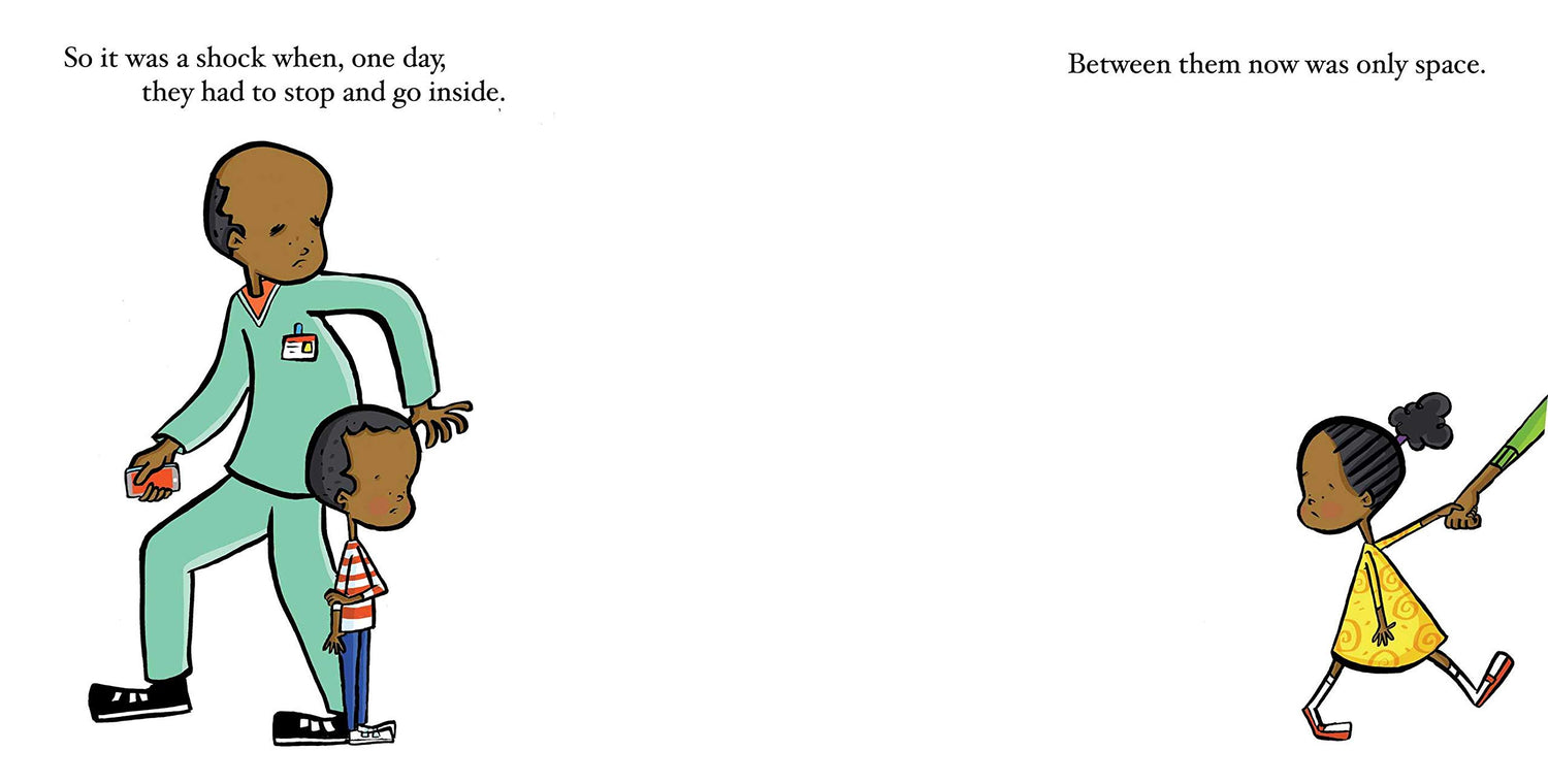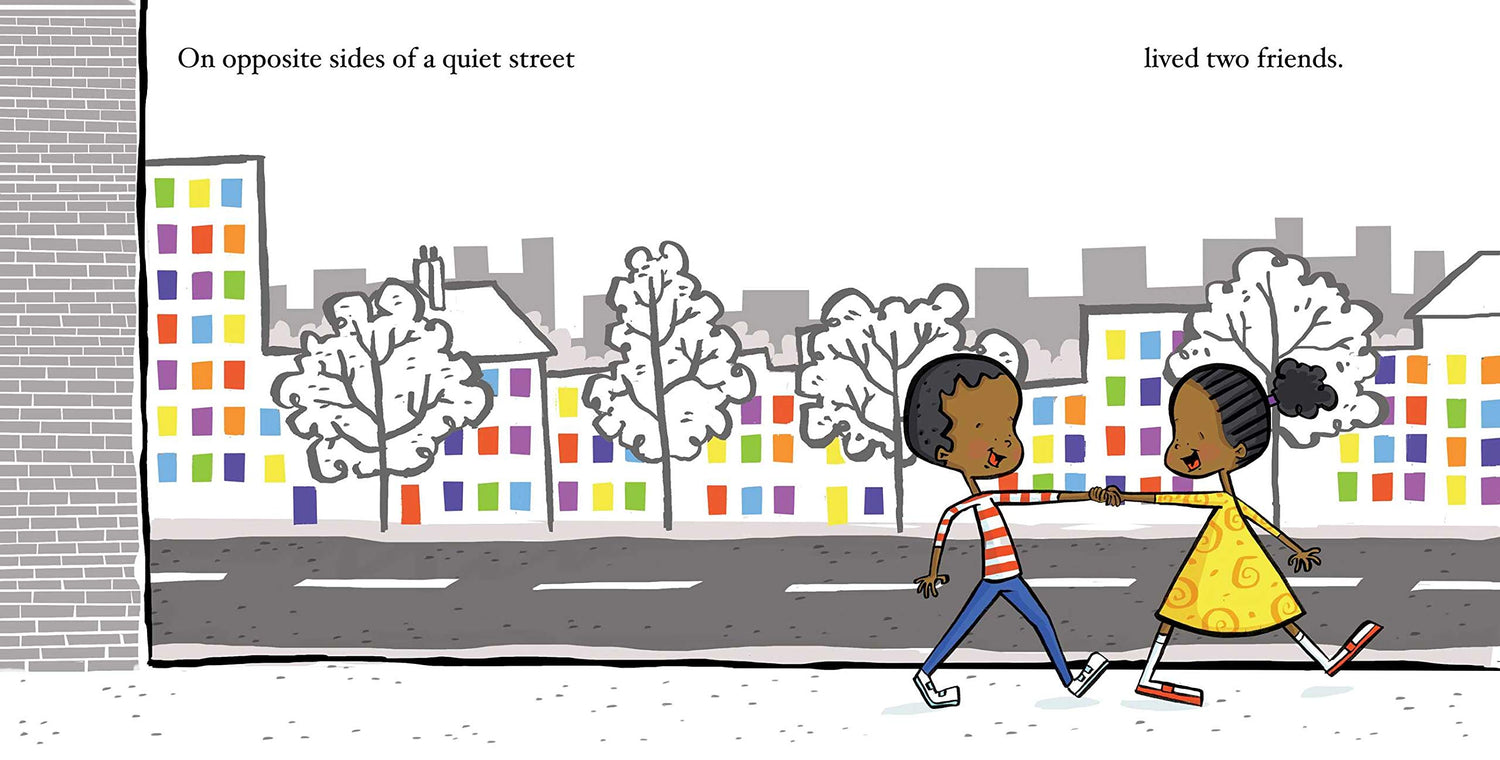 On opposite sides of a quiet street lived two friends. From morning to evening, they played. ''You two are stuck together like glue!'' their parents and teachers laughed. So it was a shock when, one day, they had to stop and go inside. Between them now was only space. Suddenly, outside was scary and felt very large. Their parents were full of whispers and frowns and the worry inside felt heavy. Where can you put friendship when friends are apart? Slowly, they learned. They found that, across the street and through windows, they could give each other a hug. They discovered that a smile is a hug. A wave is a hug. And funny faces, a phone call, a song. They discovered that when you're apart a friendship doesn't leave. With time and effort it will grow and grow, until it is big, bigger than all fears.