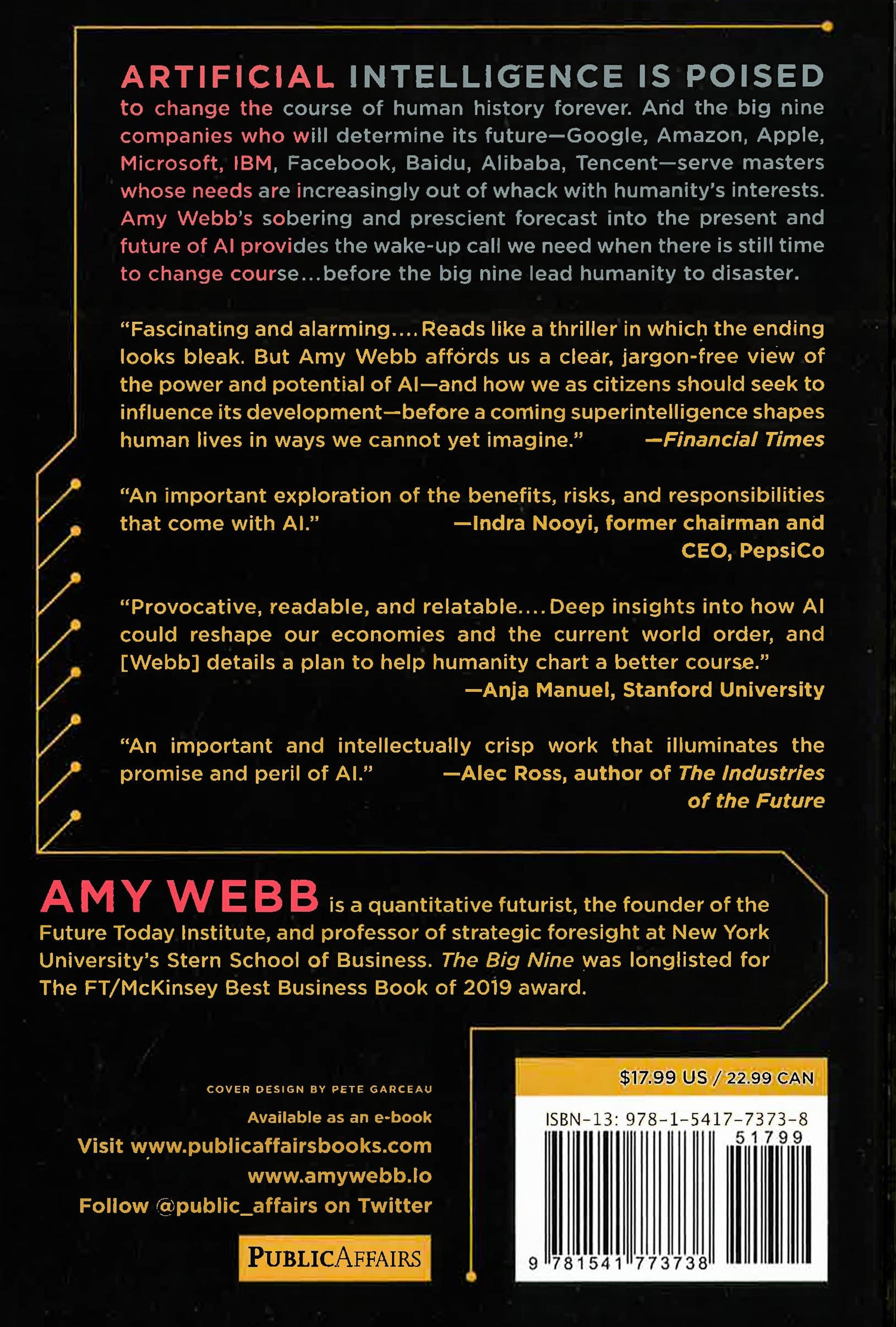 We like to think that we are in control of the future of "artificial" intelligence. The reality, though, is that we--the everyday people whose data powers AI--aren't actually in control of anything. When, for example, we speak with Alexa, we contribute that data to a system we can't see and have no input into--one largely free from regulation or oversight. The big nine corporations--Amazon, Google, Facebook, Tencent, Baidu, Alibaba, Microsoft, IBM and Apple--are the new gods of AI and are short-changing our futures to reap immediate financial gain. In this book, Amy Webb reveals the pervasive, invisible ways in which the foundations of AI - the people working on the system, their motivations, the technology itself - are broken. Within our lifetimes, AI will, by design, begin to behave unpredictably, thinking and acting in ways which defy human logic. The big nine corporations may be inadvertently building and enabling vast arrays of intelligent systems that don't share our motivations, desires, or hopes for the future of humanity.Much more than a passionate, human-centred call-to-arms, this book delivers a strategy for changing course and provides a path for liberating us from algorithmic decision-makers and powerful corporations.