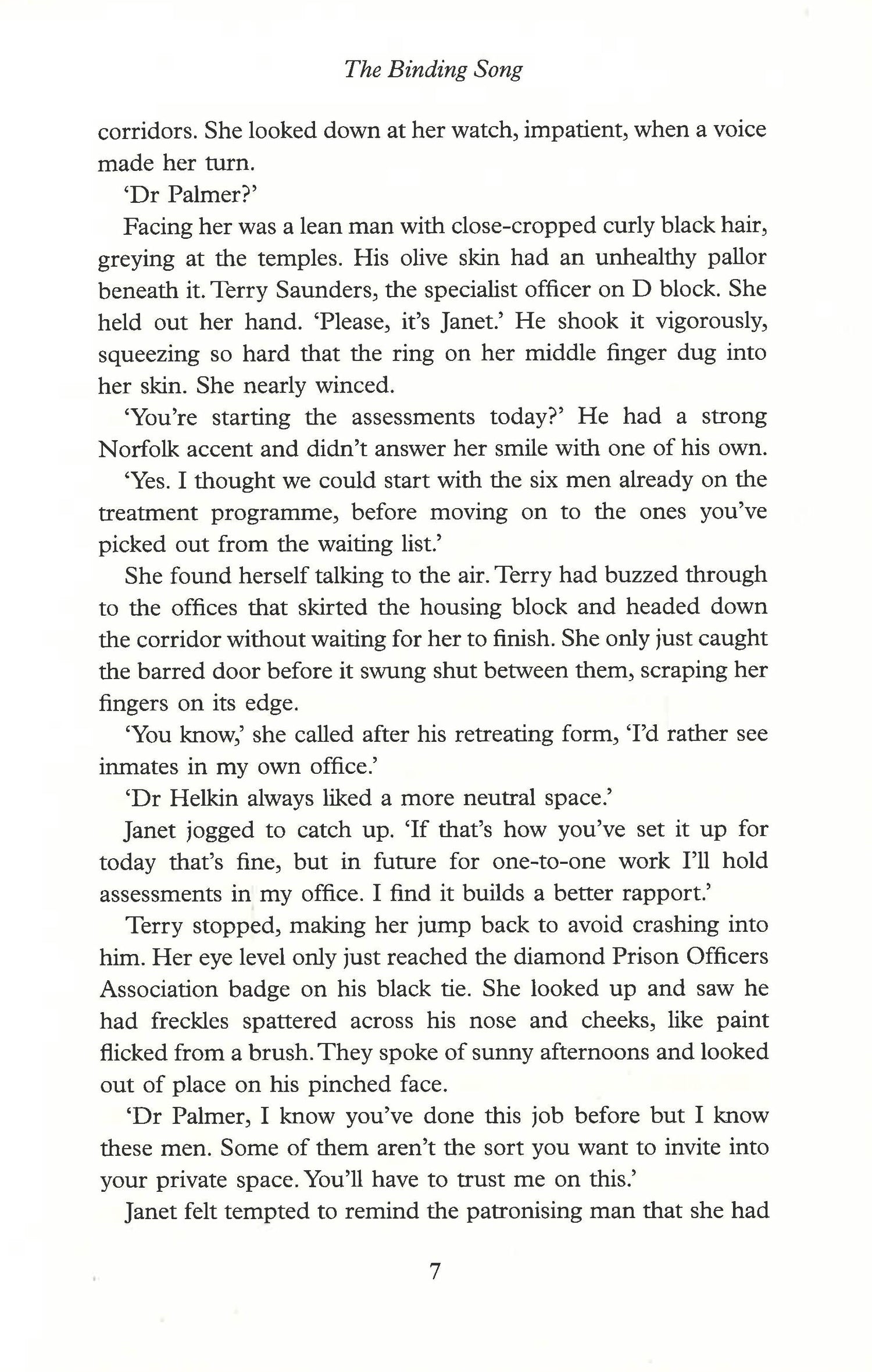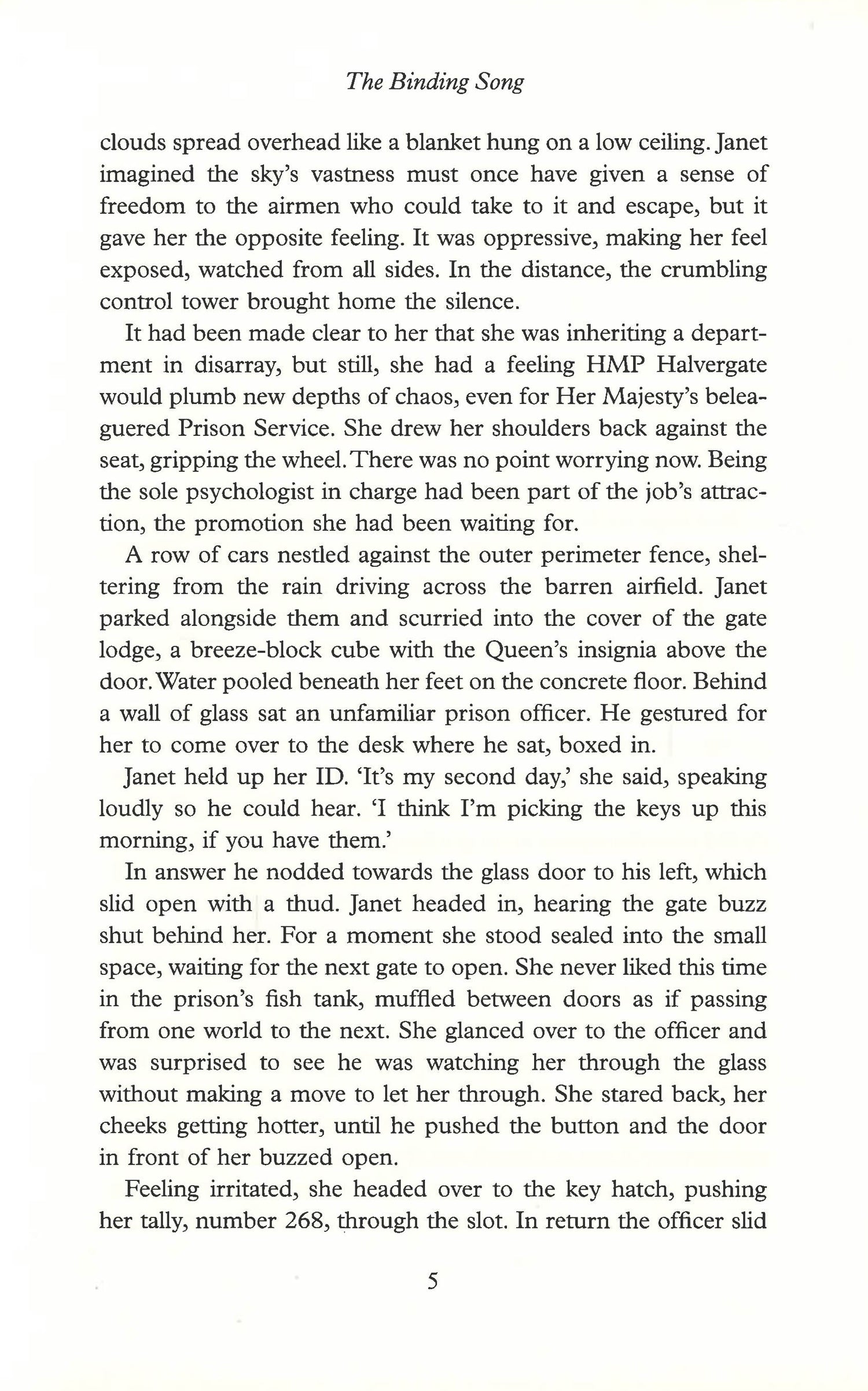 FROM THE WINNER OF THE STEPHEN KING AND GUARDIAN SHORT STORY COMPETITION. A chilling debut for fans of Mo Hayder and Sharon Bolton, THE BINDING SONG takes you on a trip to Halvergate Prison. If you're lucky, you'll get to leave... 'Splendidly unsettling' John Connolly Dr Janet Palmer is the new lead psychologist at HMP Halvergate in a remote, bleak area of Norfolk. At first, she was excited by the promotion. Then she starts to see how many secrets are hiding behind the high walls. A string of inmates have committed suicide, leaving no reasons why, and her predecessor has disappeared - along with his notes. The staff are hostile, the threat of violence is ever-present, and there are rumours of an eyeless woman stalking the corridors, punishing the inmates for their sins. Janet is determined to find out what is really going on. But the longer she stays and the deeper she digs, the more uncertain she feels. Halvergate is haunted by something. But it may be a terror worse than ghosts... What reviewers are saying about THE BINDING SONG: 'This book is creepy and moody in tone throughout and is certainly the kind of book you want to read with the lights on!' Goodreads reviewer 'One of the most atmospheric, eerie books I've ever read' Goodreads reviewer 'One of my highlights of 2017...an exciting, dramatic, scary and compelling read.' Goodreads reviewer