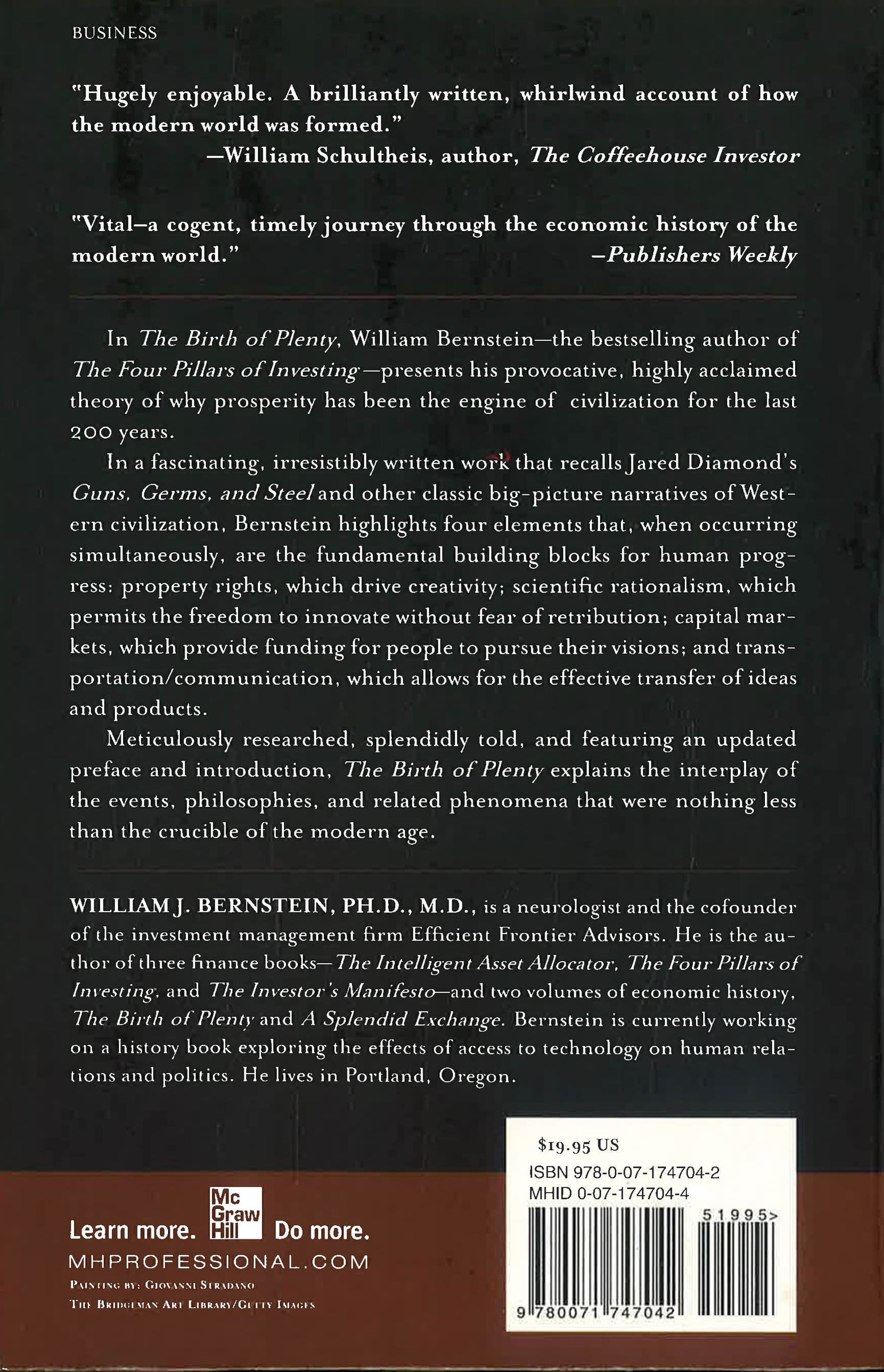 "Compact and immensely readable . . . a tour de force. Prepare to be amazed." - John C. Bogle, Founder and Former CEO, The Vanguard Group "Vital-a cogent, timely journey through the economic history of the modern world." - Publishers WeeklyIn The Birth of Plenty, William Bernstein, the bestselling author of The Four Pillars of Investing, presents his provocative, highly acclaimed theory of why prosperity has been the engine of civilization for the last 200 years. This is a fascinating, irresistibly written "big-picture" work that highlights and explains the impact of four elements that when occurring simultaneously, are the fundamental building blocks for human progress: Property rights, which drive creativity Scientific rationalism, which permits the freedom to innovate without fear of retribution; Capital markets, which provide funding for people to pursue their visions; Transportation/communication, which allows for the effective transfer of ideas and products. Meticulously researched, splendidly told, and featuring a new preface and introduction, The Birth of Plenty explains the interplay of the events, philosophies, and related phenomena that were nothing less than the crucible of the modern age. This is one of the rare books that will change how you look at the world.