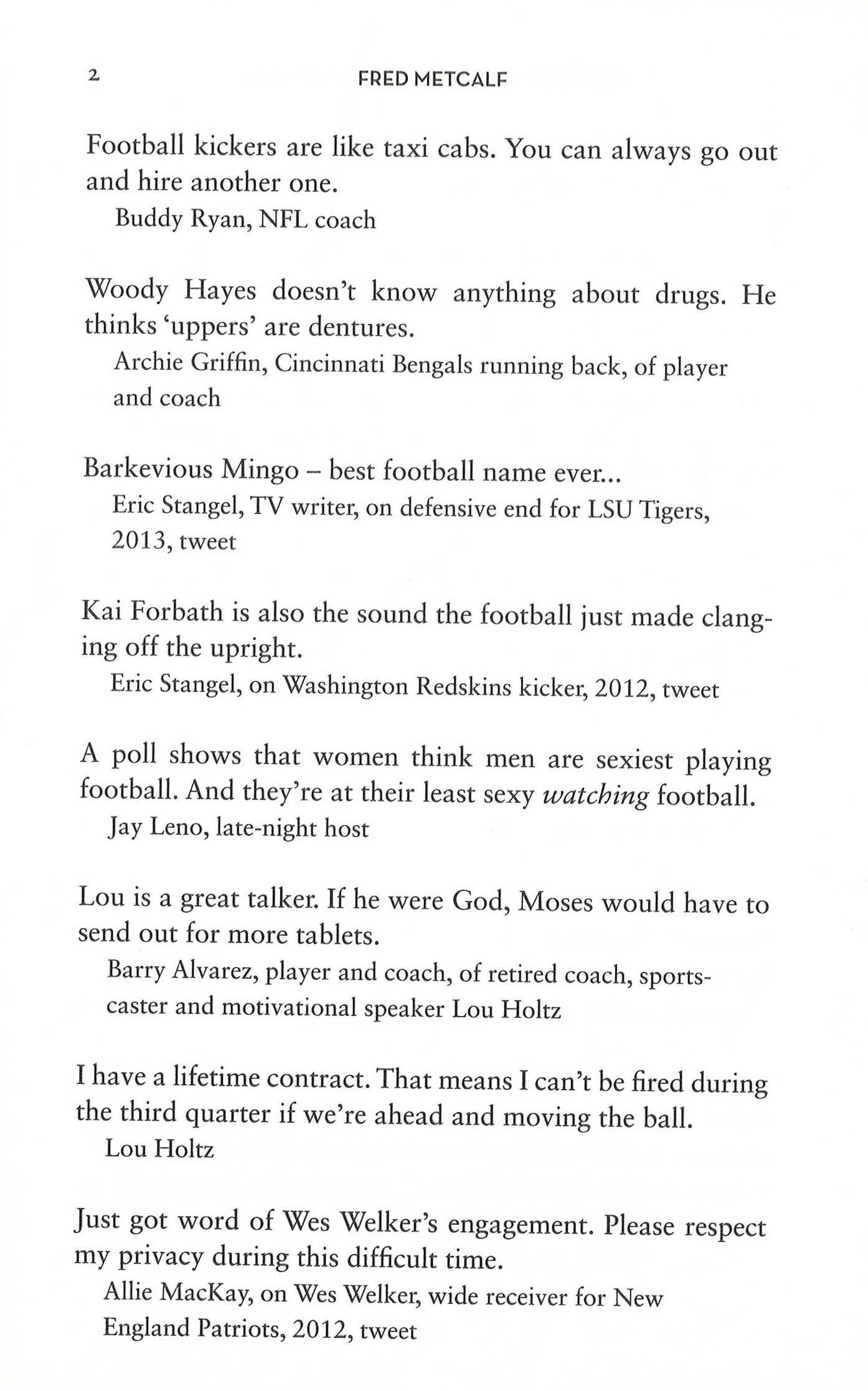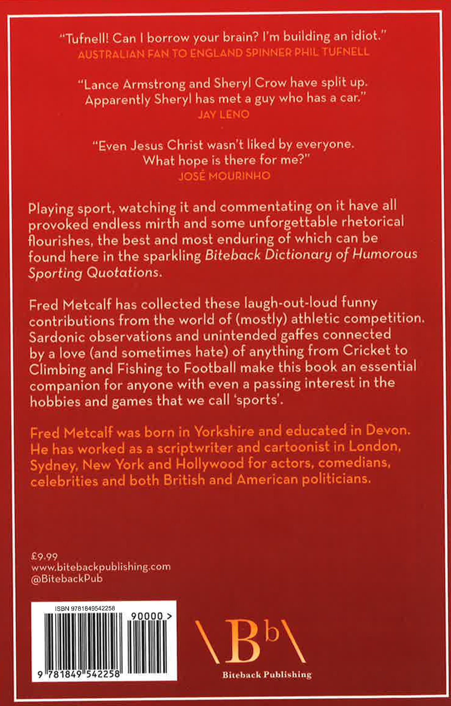 "Tufnell! Can I borrow your brain? I'm building an idiot." Australian fan to England spinner Phil Tufnell "Lance Armstrong and Sheryl Crow have split up. Apparently Sheryl has met a guy who has a car." Jay Leno "Even Jesus Christ wasn't liked by everyone. What hope is there for me?" Jose Mourinho Playing sport, watching it and commentating on it have all provoked endless mirth and some unforgettable rhetorical flourishes, the best and most enduring of which can be found here in the sparkling Biteback Dictionary of Humorous Sporting Quotations. Fred Metcalf has collected these laugh-out-loud funny contributions from the world of (mostly) athletic competition. Sardonic observations and unintended gaffes connected by a love (and sometimes hate) of anything from Cricket to Climbing and Fishing to Football make this book an essential companion for anyone with even a passing interest in the hobbies and games that we call 'sports'.