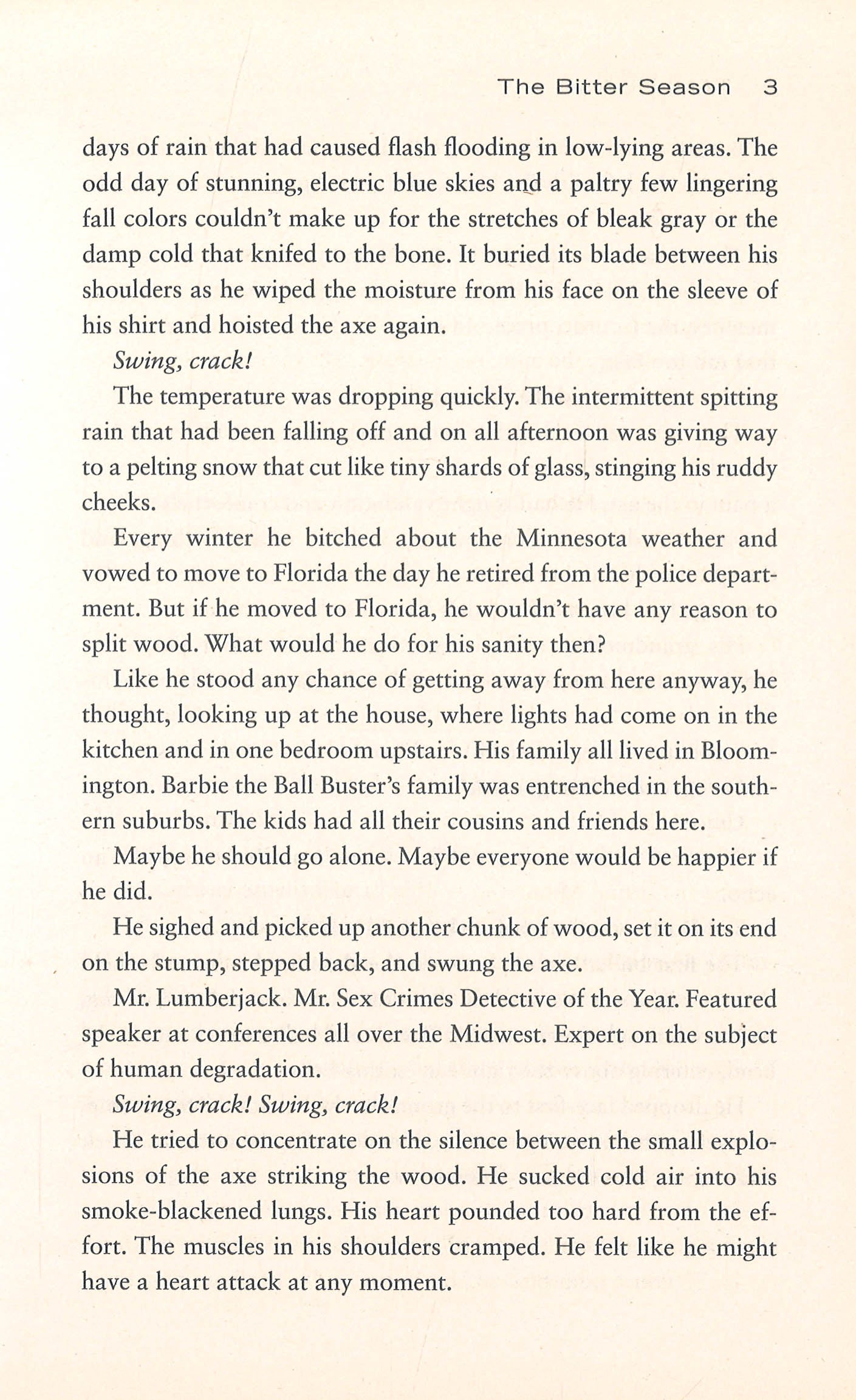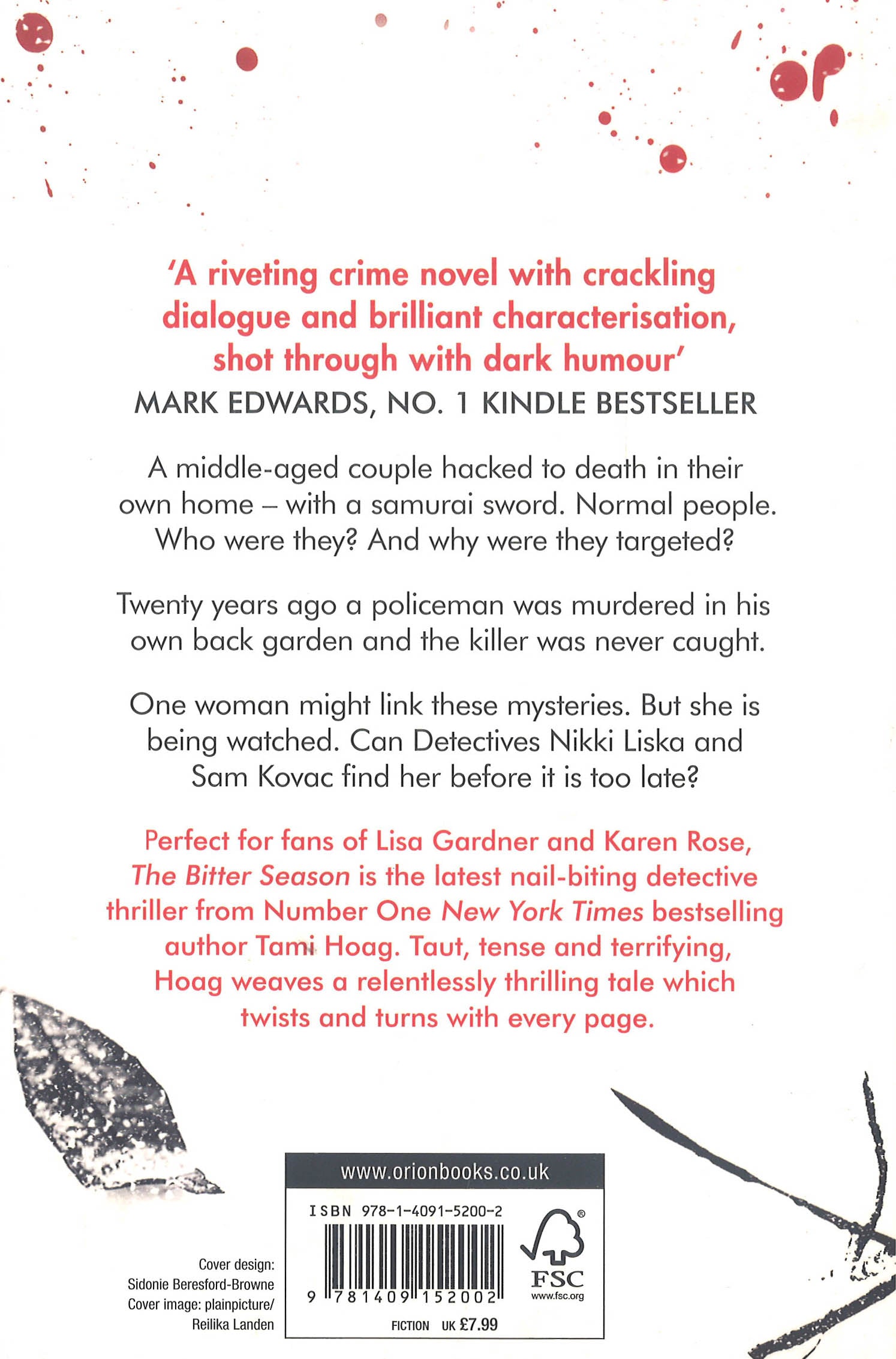 In THE BITTER SEASON, Tami Hoag - the Sunday Times bestselling author of A THIN DARK LINE - returns with book five in the gripping Kovac & Liska detective series. 'As good as Michael Connelly or Karin Slaughter at their best.' Mark Edwards, No. 1 Kindle bestseller. A middle-aged couple - hacked to death in their own home - with a samurai sword. Normal people. Who were they? And why were they targeted? Twenty years ago a policeman was murdered in his own back garden and the killer was never caught. One woman might link these mysteries. But she is being watched. Can Detectives Nikki Liska and Sam Kovac find her before it is too late? A page-turning thriller packed with suspense. If you like Angela Marsons, Rachel Abbott and Karen Rose you will love Tami Hoag.