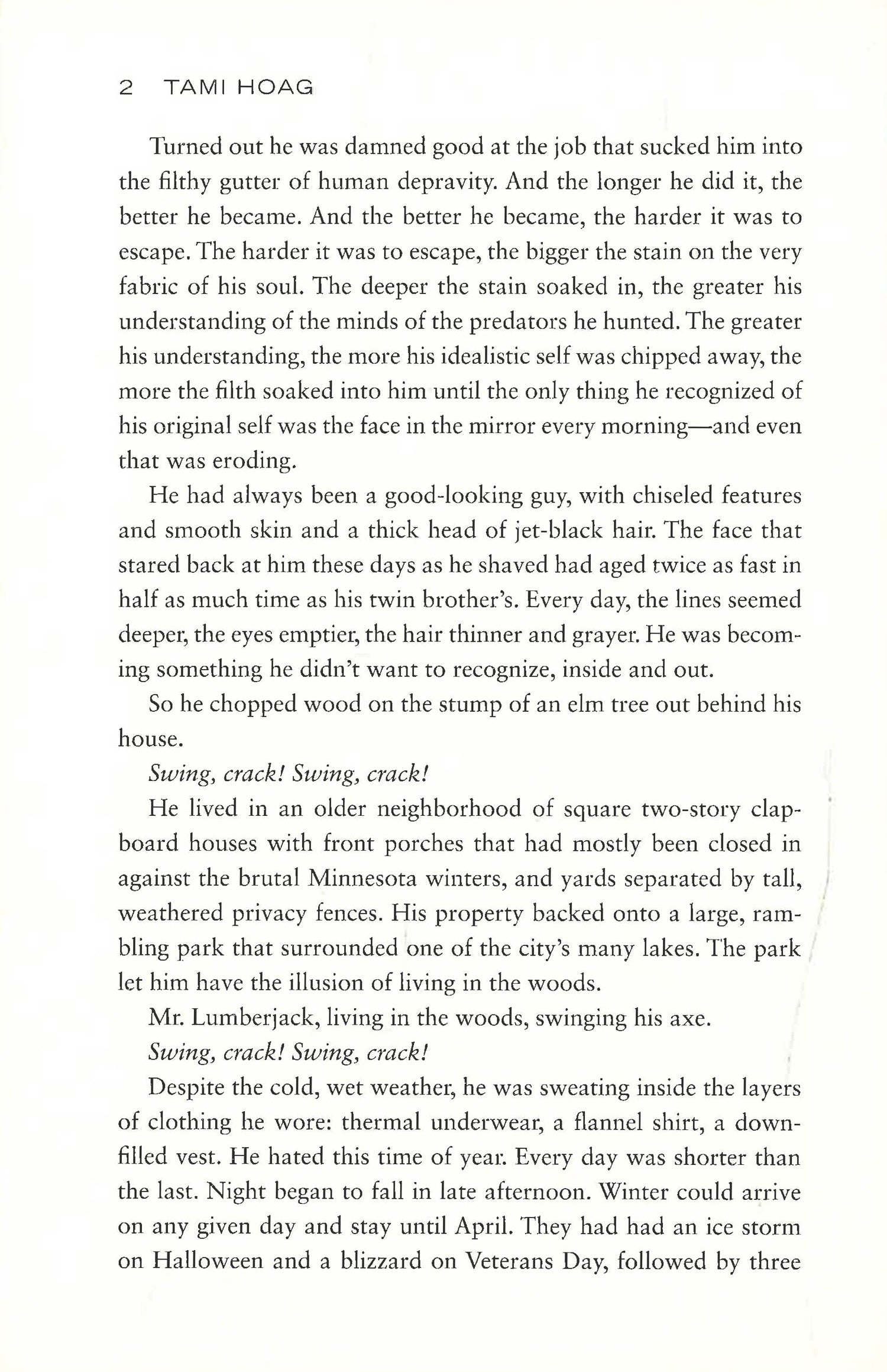 Kovac and Liska take on multiple twisted cases as #1 New York Times bestselling author Tami Hoag explores a murder from the past, a murder from the present, and a life that was never meant to be. As the bitter weather of late fall descends on Minneapolis, Detective Nikki Liska is restless, already bored with her new assignment to the cold case squad. She misses the rush of pulling an all-nighter and the sense of urgency of hunting a killer on the loose. Most of all she misses her old partner, Sam Kovac. Kovac is having an even harder time adjusting to Liska's absence but is distracted from his troubles by an especially brutal double homicide: a prominent university professor and his wife, bludgeoned and hacked to death in their home with a ceremonial Japanese samurai sword. Liska's case--the unsolved murder of a decorated sex crimes detective--is less of a distraction: Twenty-five years later, there is little hope for finding the killer who got away. Meanwhile, Minneapolis resident Evi Burke has a life she only dreamed of as a kid in and out of foster care: a beautiful home, a loving family, a fulfilling job. But a danger from her past is stalking her idyllic present, bent on destroying the perfect life she was never meant to have. As the trails of two crimes a quarter of a century apart twist and cross, Kovac and Liska race to find answers before a killer strikes again.