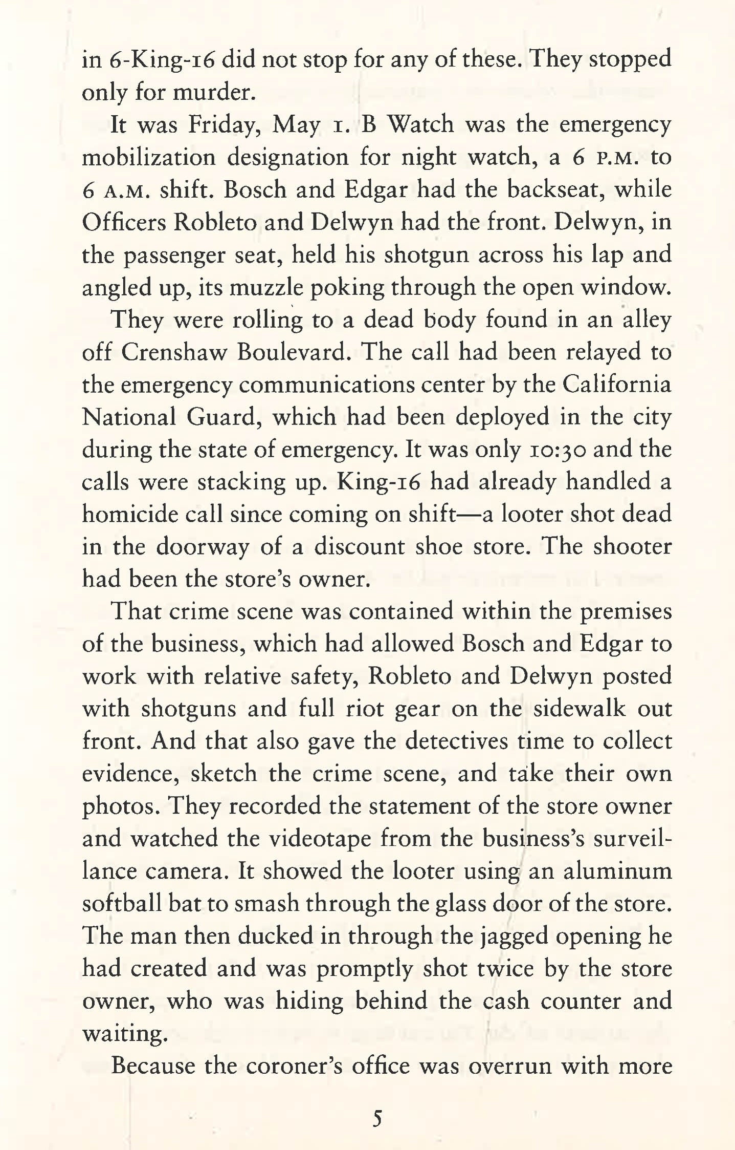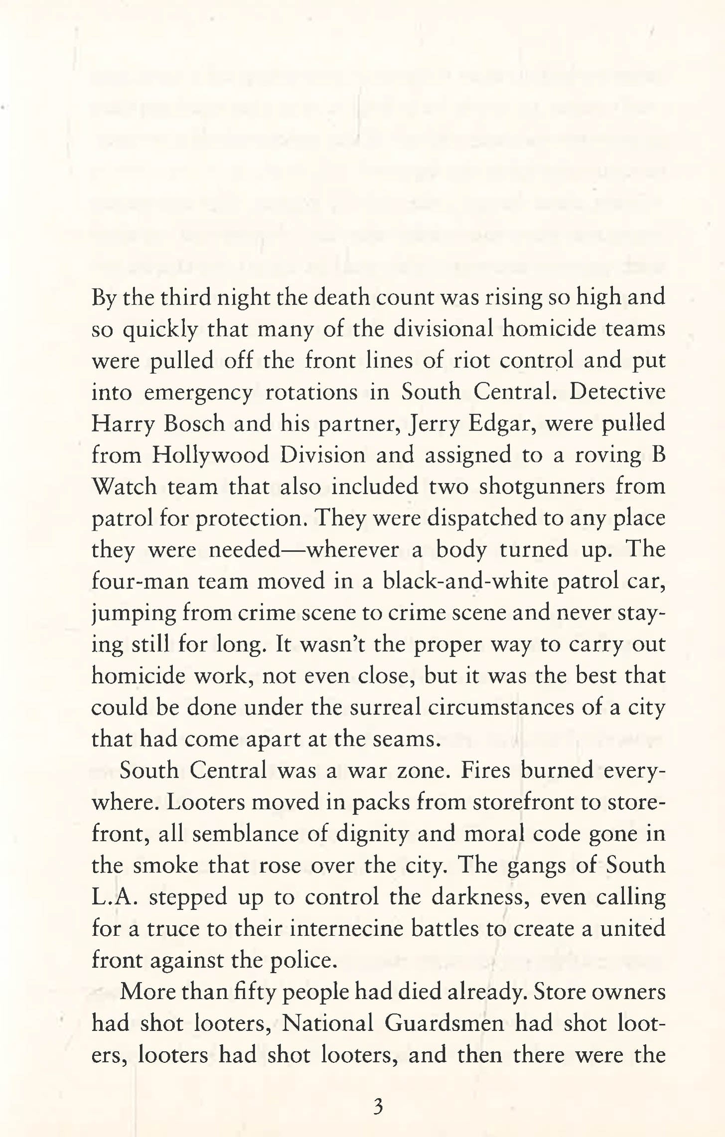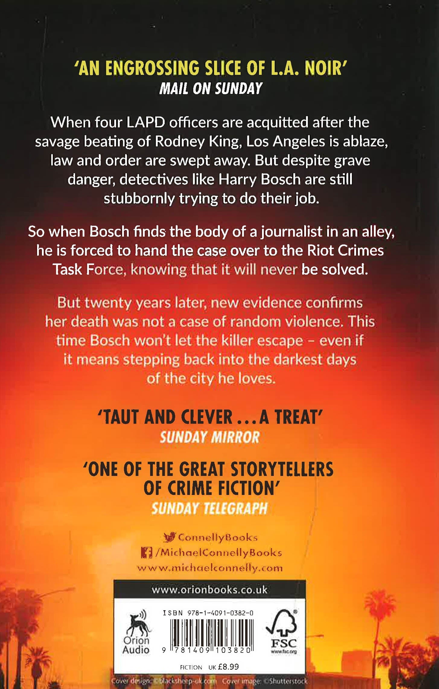 May 1992, and after four LAPD officers are acquitted following the savage beating of Rodney King, Los Angeles is ablaze. As looting and burning take over the city, law and order are swept away in a tidal wave of violence. But under threat of their lives, homicide detectives like Harry Bosch are still stubbornly trying to do their job. With no effective police presence on the streets, murder just got a whole lot easier - and investigating them a whole lot harder. When Harry finds the body of a female journalist in an alley, he is forced to hand over the case to the Riot Crimes Task Force, knowing that it will never be solved.Twenty years later, new evidence confirms her death was not a case of random violence but something much more personal. This time Harry is determined that the killer isn't going to escape - even if it means stepping back into the darkest days of the city he loves . . .
