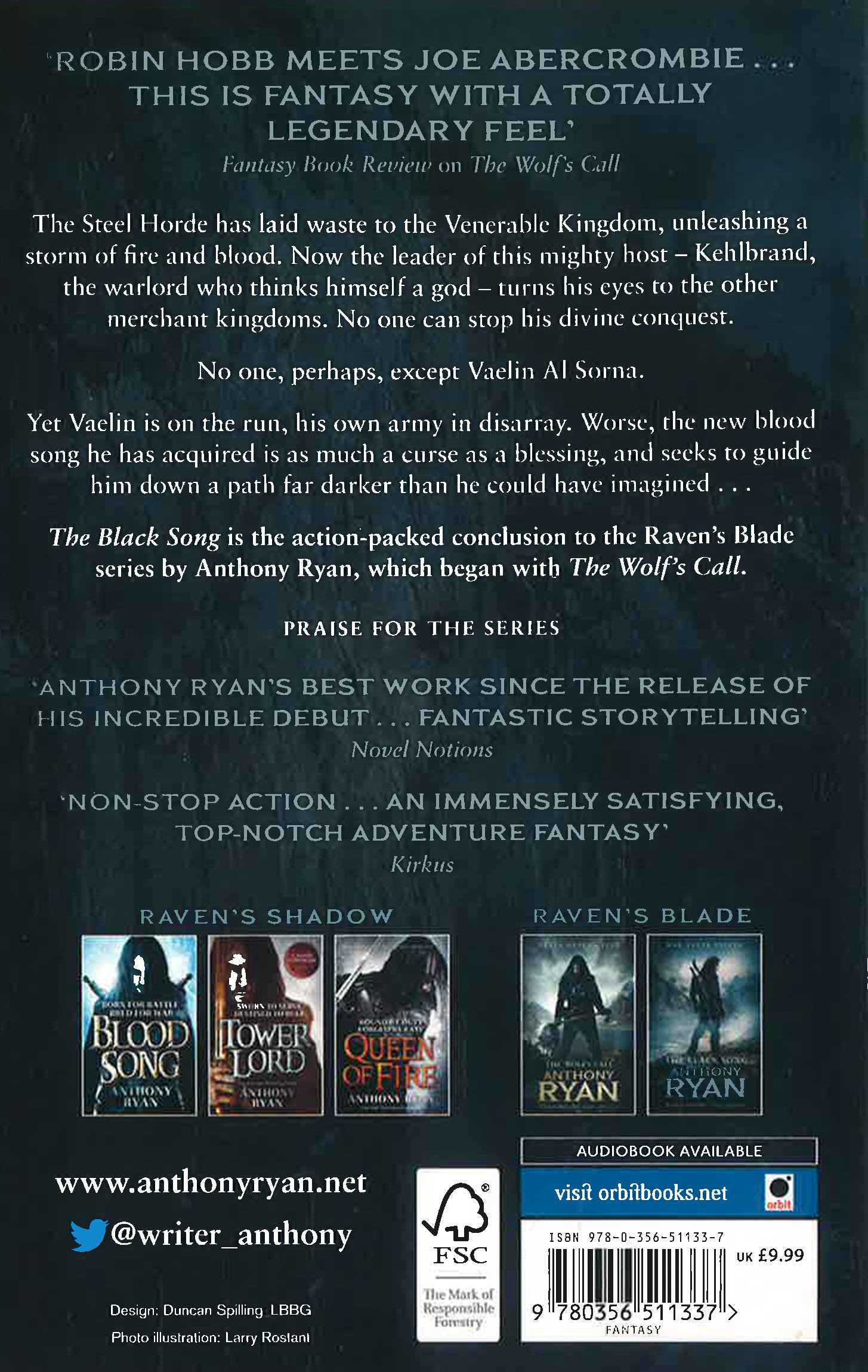 The Black Song is the action-packed conclusion to the Raven's Blade series by Anthony Ryan, which began with The Wolf's Call.