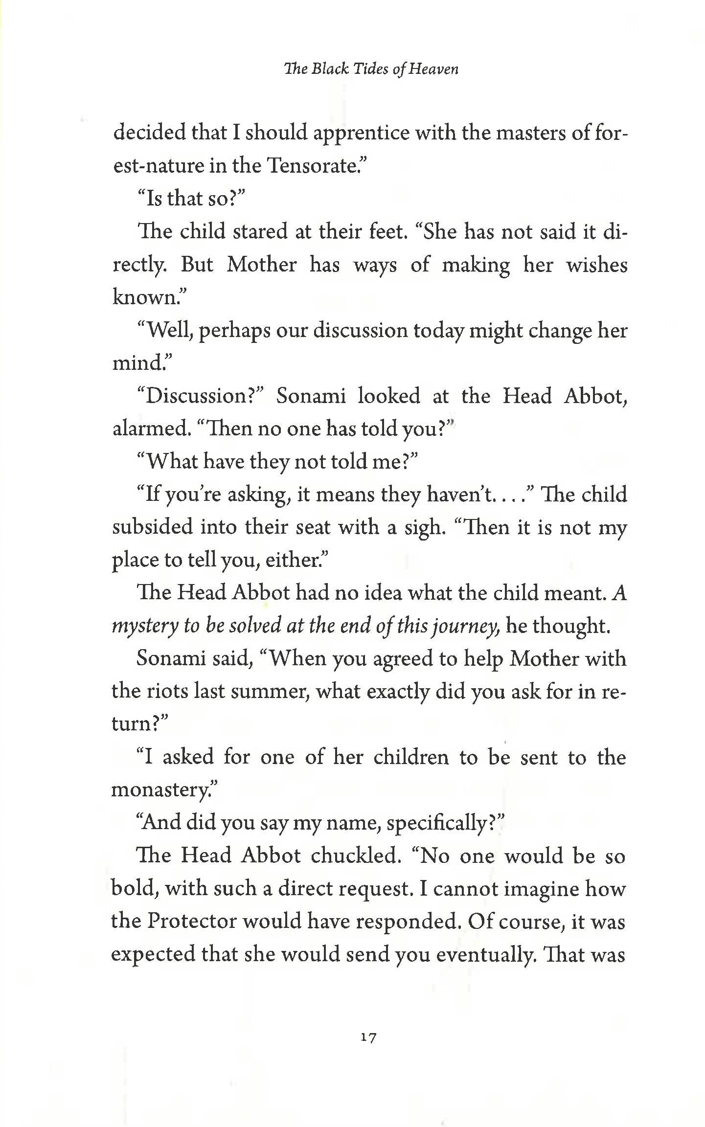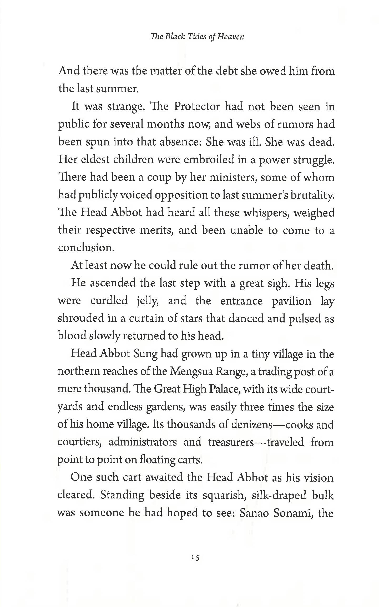 Mokoya and Akeha, the twin children of the Protector, were sold to the Grand Monastery as infants. While Mokoya developed her strange prophetic gift, Akeha was always the one who could see the strings that moved adults to action. While Mokoya received visions of what would be, Akeha realized what could be. What's more, they saw the sickness at the heart of their mother's Protectorate.