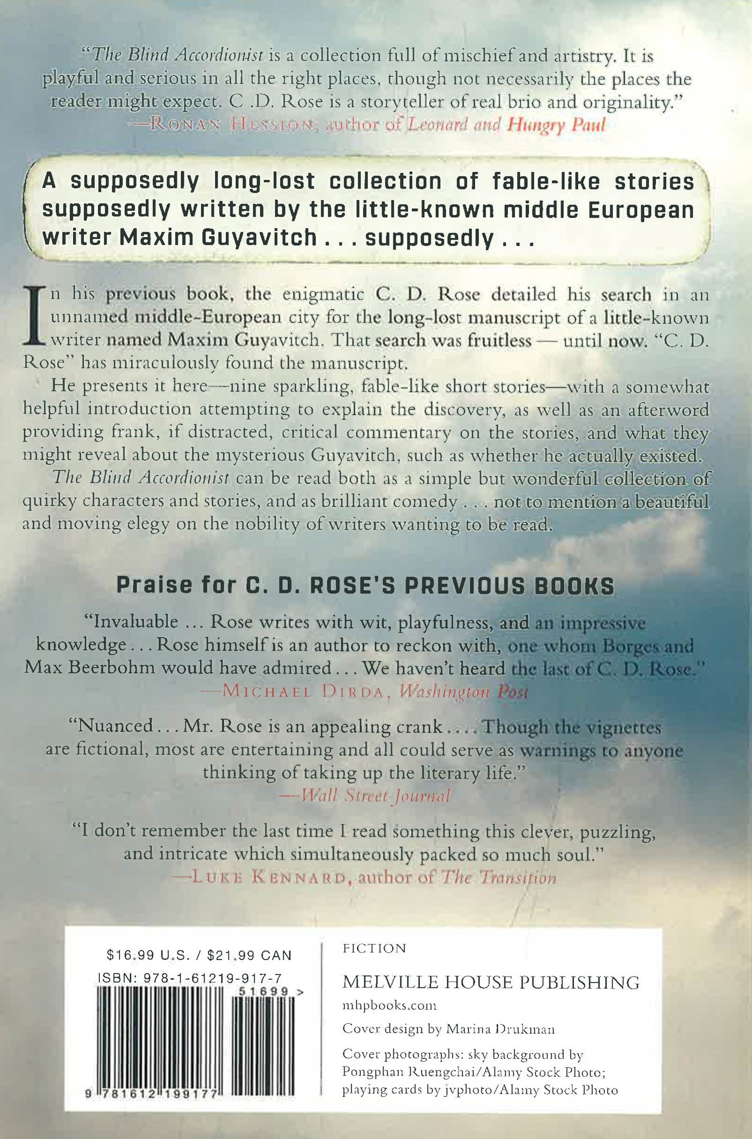 In the novel WHO'S WHO WHEN EVERYONE IS SOMEONE ELSE, the character C.D. Rose (not to be confused with the author C.D. Rose) searches an unnamed middle-European city for the long-lost manuscript of a little-known writer named Maxim Guyavitch. That search was fruitless, but in THE BLIND ACCORDIONIST, C.D. Rose has found the manuscript--nine sparkling, fable-like short stories--and he presents them here with an (hilarious) introduction explaining the discovery, and an afterword providing (hilarious) critical commentary on the stories, and what they might reveal about the mysterious Guyavitch.