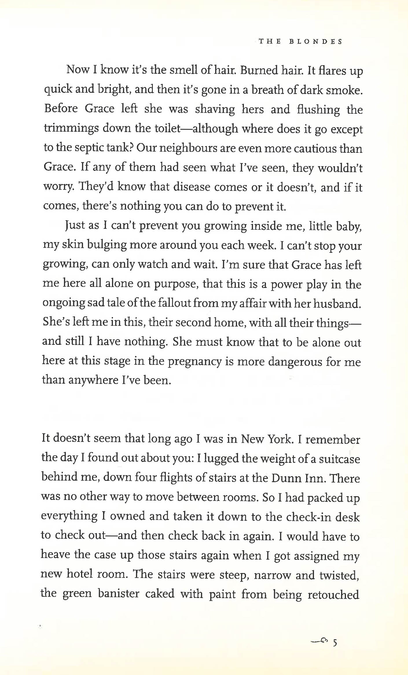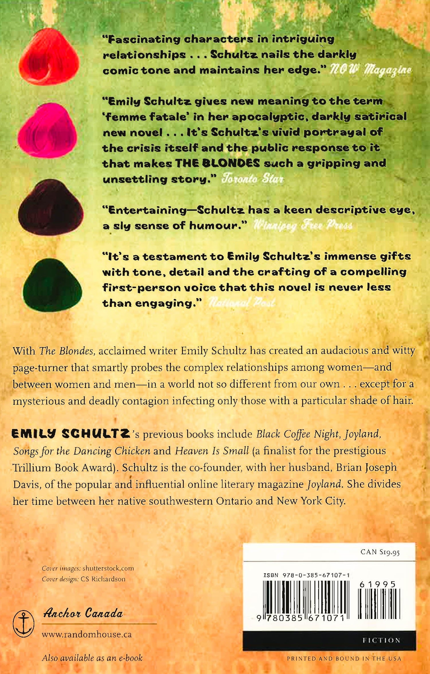 A breakout novel for a young writer whose last book was shortlisted for the Trillium Prize alongside Anne Michaels and Margaret Atwood, and whom the Toronto Star called a "force of nature." Hazel Hayes is a graduate student living in New York City when she learns that she is pregnant from an ill-advised affair with her married professor. More worrisome than the shock of this discovery is the apocalyptically bad timing: random but deadly attacks, all by women with light hair, have begun terrorizing the city's inhabitants. As the days pass, it becomes clear that the attacks are symptoms of a strange contagion that is transforming blondes from all walks of life--whether CEOs, flight attendants, students, accountants, television personalities, or academics--into rabid killers. Hazel--confused, desperate, almost penniless and soon visibly pregnant--flees the city and sets out to cross the border into Canada where she will find the one woman who just might be able to help her in a world gone awry.
