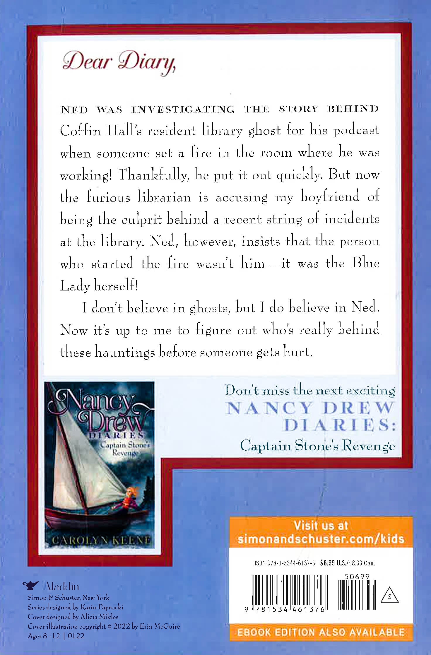 Nancy and Ned are visiting Coffin Hall, an estate turned rare books library, doing research on the library’s rumored ghost for an episode of the NedTalks podcast when a fire breaks out in the records room. One of the library’s security guards accuses Ned of arson—after all, he was the only one in the room when the fire started—but Ned swears it wasn’t him. He was trying to stop the fire. He tells Nancy he saw a lady in blue right before the incident, and thinks it was Henrietta Coffin, the ghost of Coffin Hall!