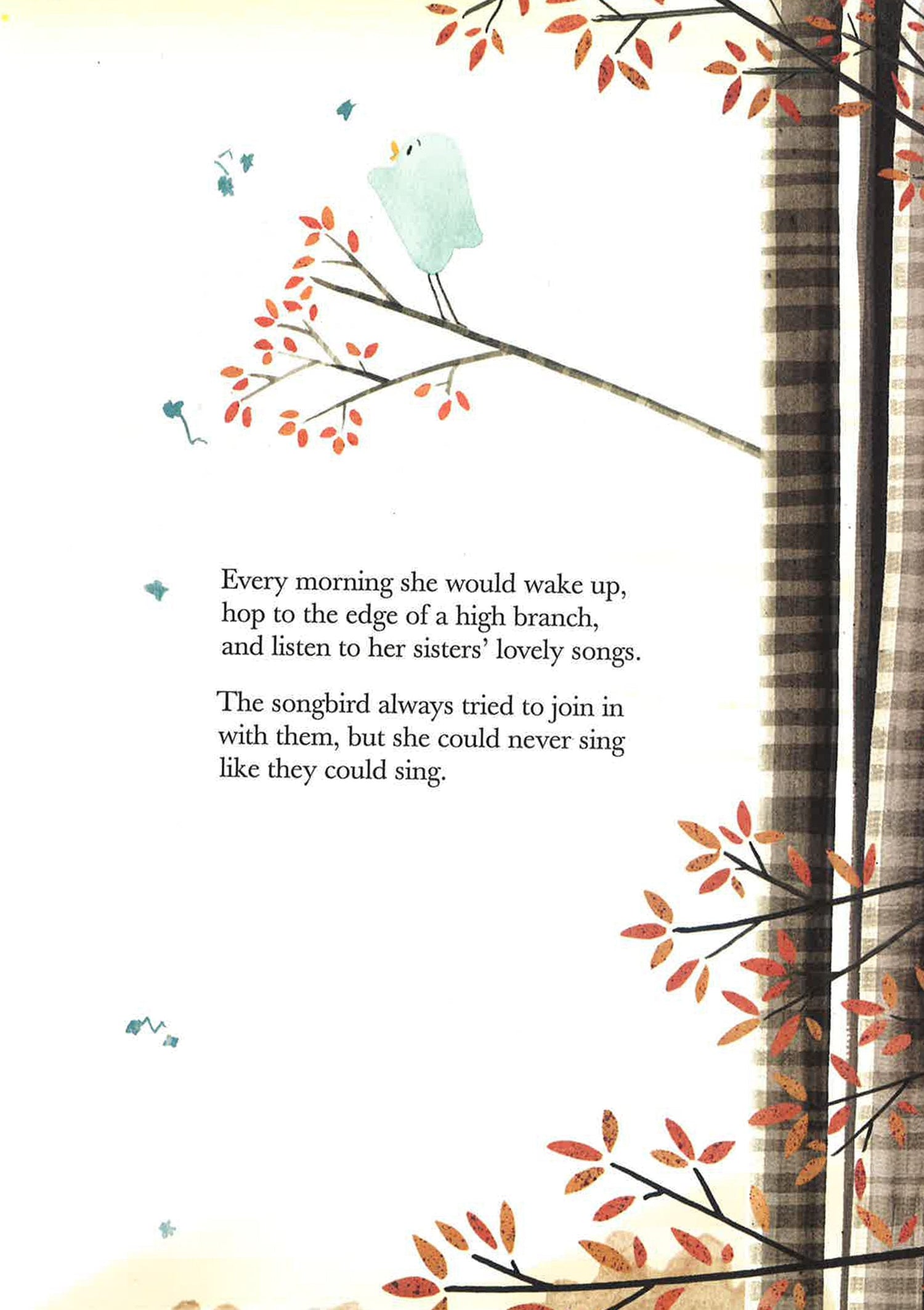 It's springtime and a young songbird hears the joyous songs of her siblings and desperately wants to sing along-only she doesn't yet know what special tune she can add to their chorus. Encouraged by her mother to leave the nest, the songbird flies off on a quest to find the song that only she can sing. With courage and tenacity, she travels far beyond her golden island home, seeking advice from a crane, an owl, and a mean-looking crow until she finally discovers her own unique voice. Told in gentle, lyrical prose and with bright, beautiful watercolor illustrations that are rich in detail, The Blue Songbird is sure to become a perennial favorite-a story that teaches children to go on adventures and to discover what makes them truly unique. An empowering story for kids of all shapes, sizes, and singing ability.