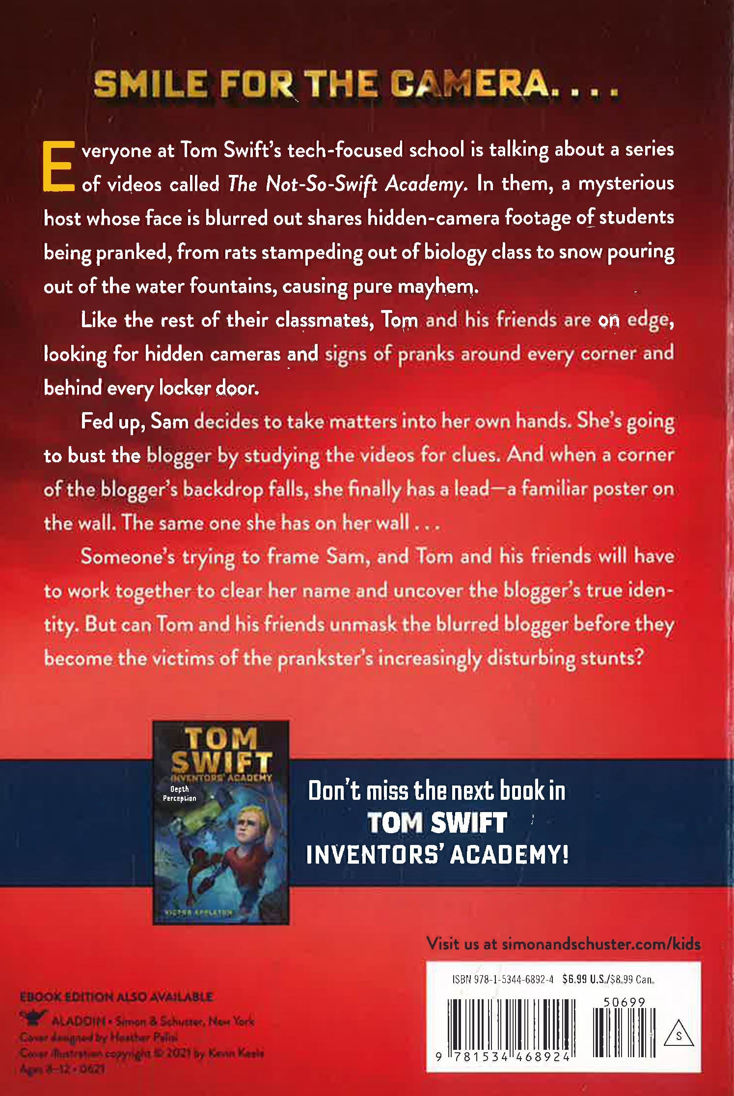 A series of videos called “The Not-so-Swift Academy” are the talk of Tom Swift’s tech-focused school. A mysterious host whose face is blurred shows hidden camera footage of different students being pranked—from a rubber tarantula leaping out of one of the terrariums to water flash freezing.