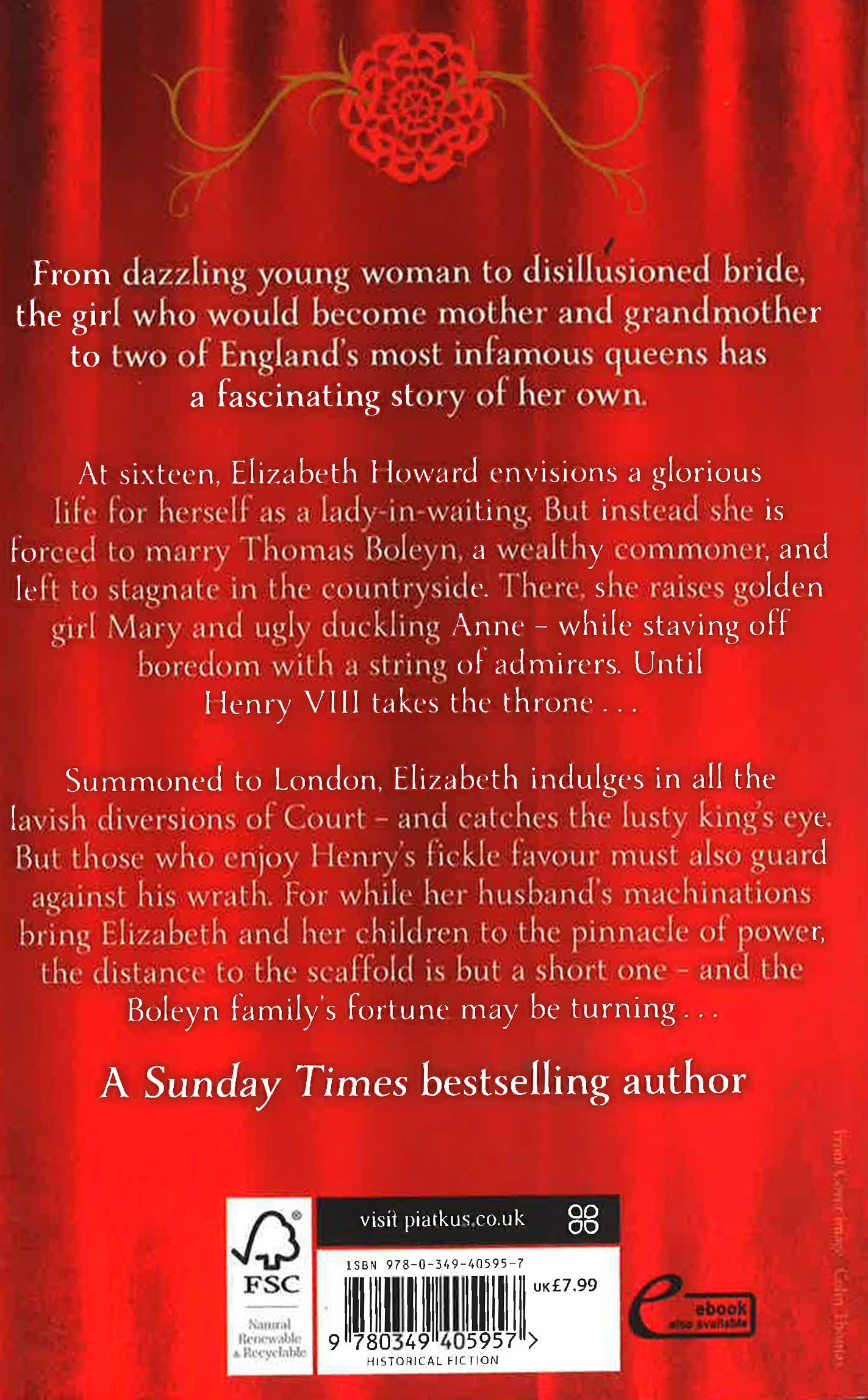 Sixteen, of noble birth and stunningly beautiful, Elizabeth Howard envisions a glorious life for herself as lady-in-waiting to the future queen, Catherine of Aragon. But when she is forced to marry Thomas Boleyn, a wealthy commoner, Elizabeth is left to stagnate in the countryside while her detested husband pursues his ambitions. There, she raises golden girl Mary, moody George, and ugly duckling Anne - while staving off boredom with a string of admirers. Until Henry VIII takes the throne . . .