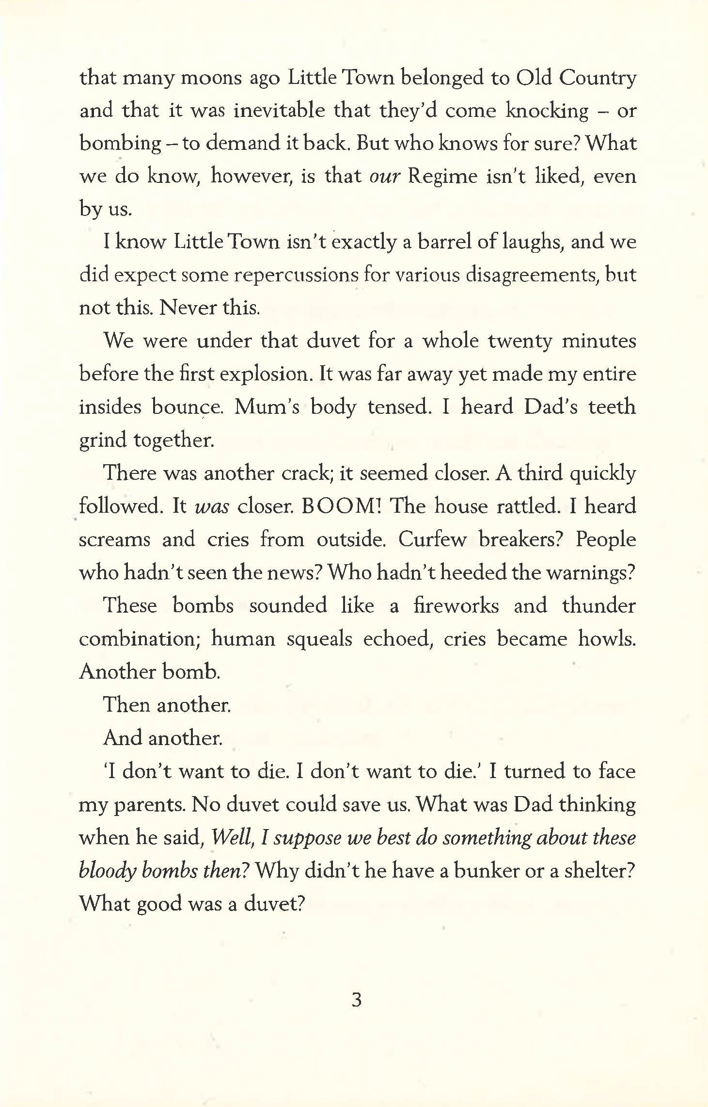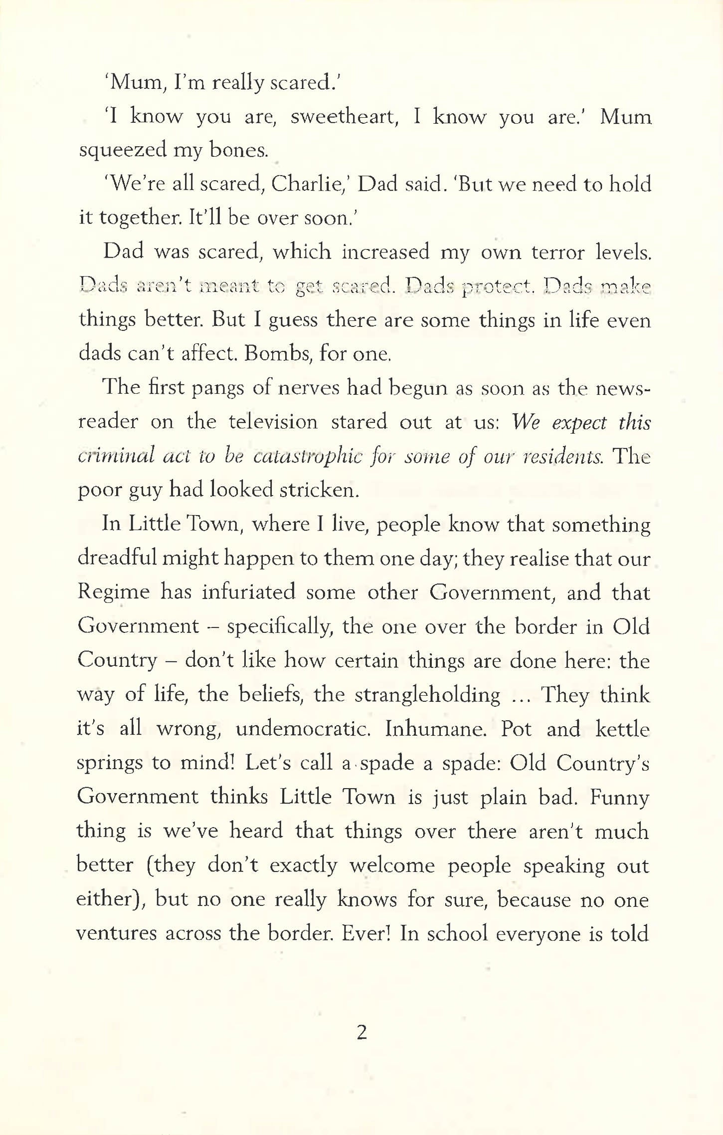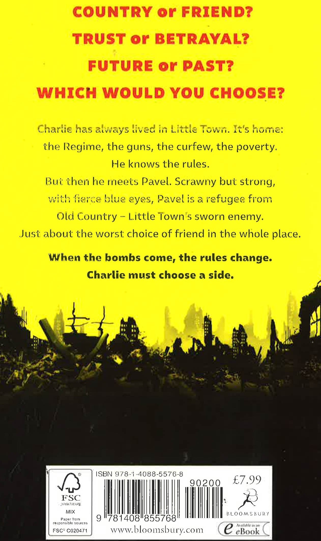Fourteen-year-old Charlie Law has lived in Little Town, on the border with Old Country, all his life. He knows the rules: no going out after dark; no drinking; no litter; no fighting. You don't want to get on the wrong side of the people who run Little Town. When he meets Pavel Duda, a refugee from Old Country, the rules start to get broken. Then the bombs come, and the soldiers from Old Country, and Little Town changes for ever.