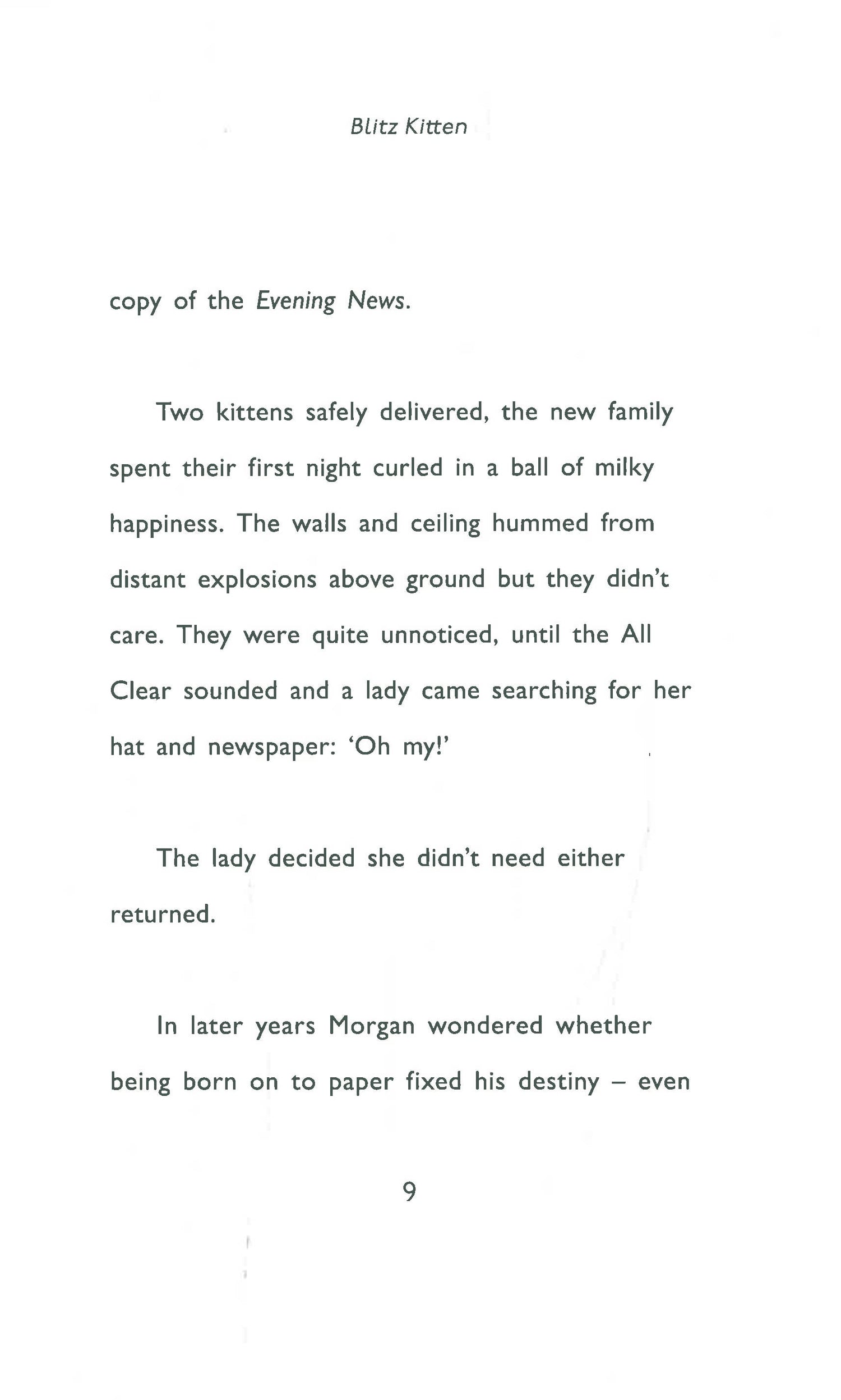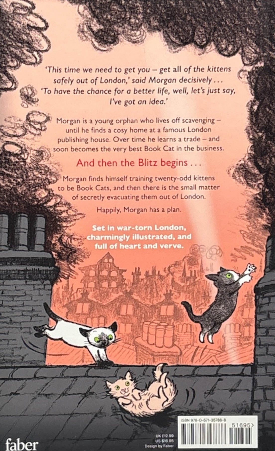 Morgan is a young orphan who lives off scavenging - until he finds a cosy home at a famous London publishing house. Over time he learns a trade - and soon becomes the very best book cat in the business. And then the Blitz begins. Morgan finds himself training up twenty odd kittens to be book cats, and then there is the small matter of secretly evacuating them out of London. Happily, Morgan has a plan.