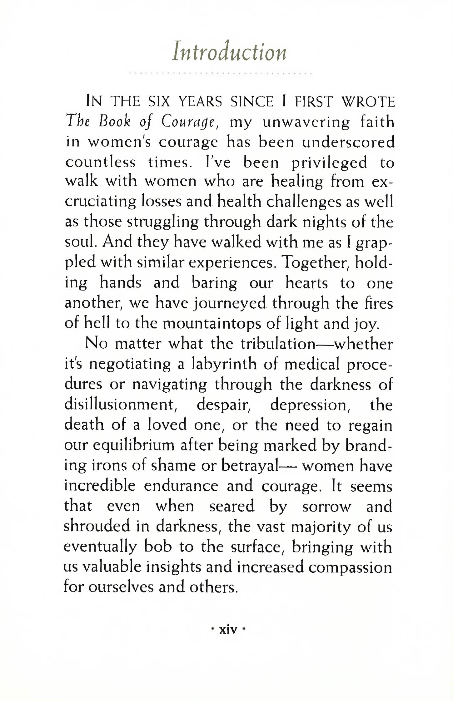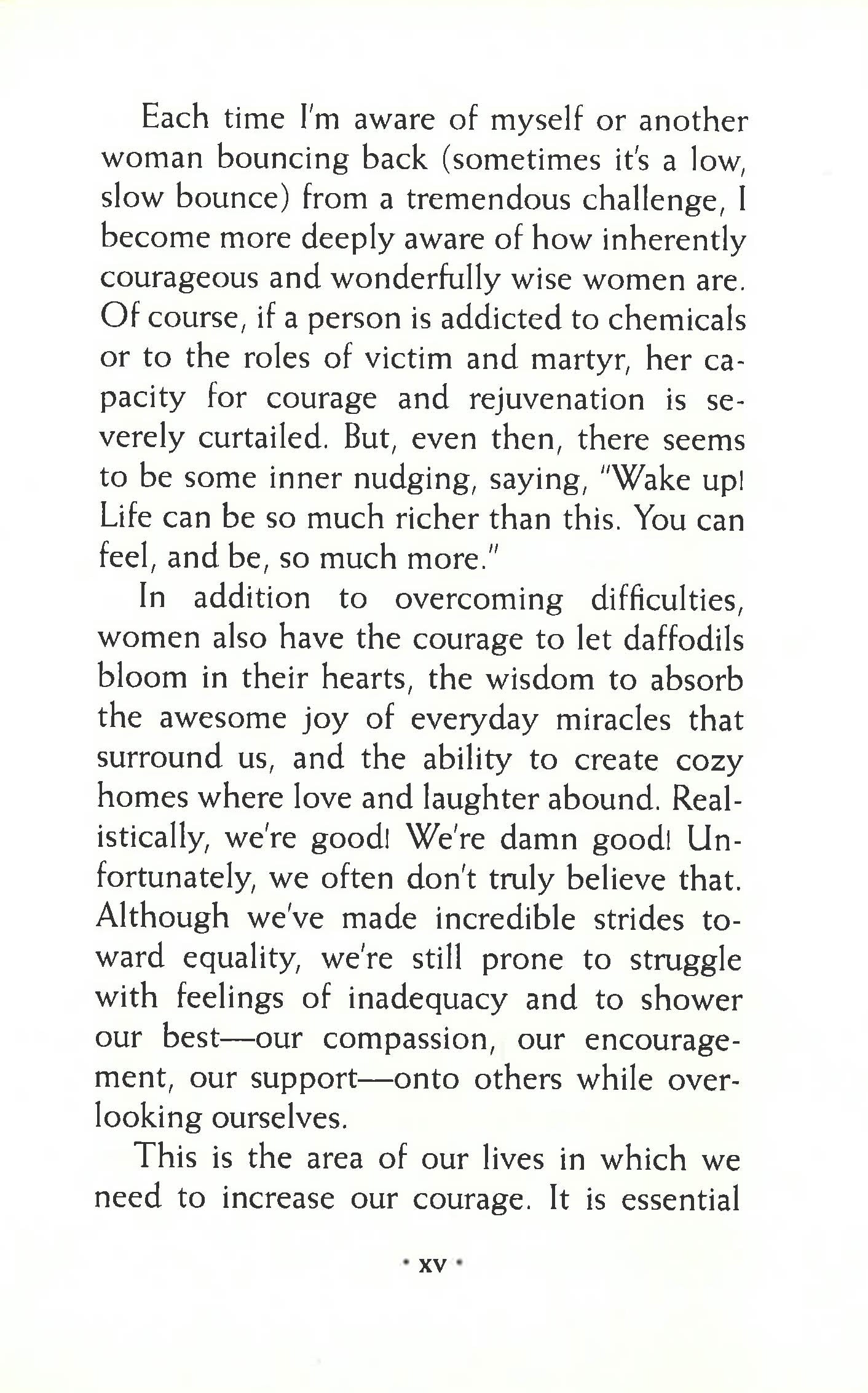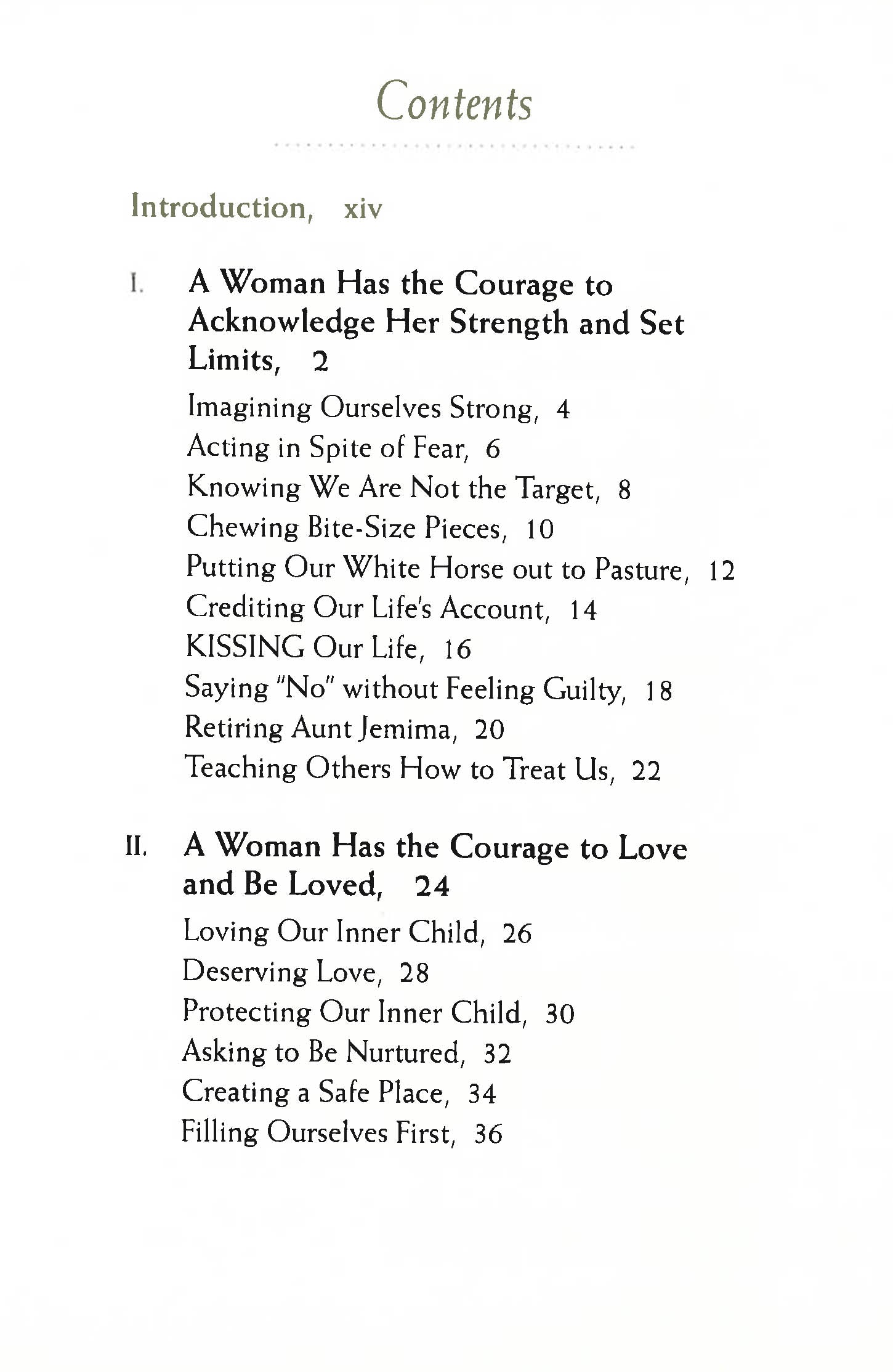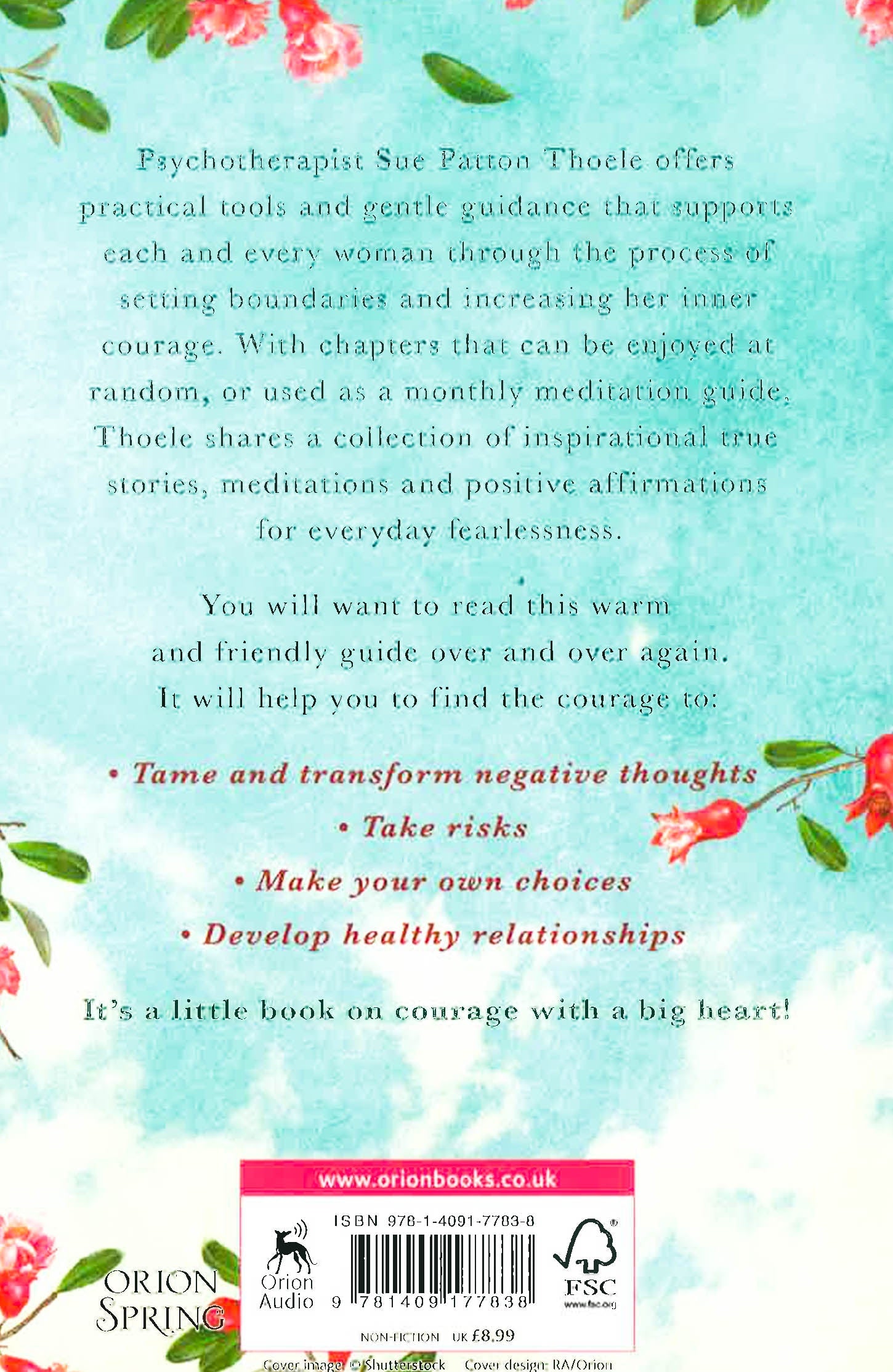 Psychotherapist Sue Patton Thoele is on a mission to help each and every woman uncover her own authentic self and tap into her own wellspring of wisdom and inner-strength. Thoele offers practical tools and gentle guidance to aid in setting boundaries, changing self-defeating behaviours, and increasing passion for themselves and others.In more than a hundred short entries, Thoele offers meditations, affirmations, and true stories, including deeply personal, often humorous, revelatory stories of her own rocky path of personal growth. The reflections are presented in twelve chapters that can be tapped into randomly or used as a monthly meditation guide. Among the "A Woman Has the Courage to..." chapters are: Create Peace of Mind; Tame and Transform Her Dragons; Make Her Own Choices; Develop Healthy Relationships; Take Risks and Change; and Recognise Rainbows.