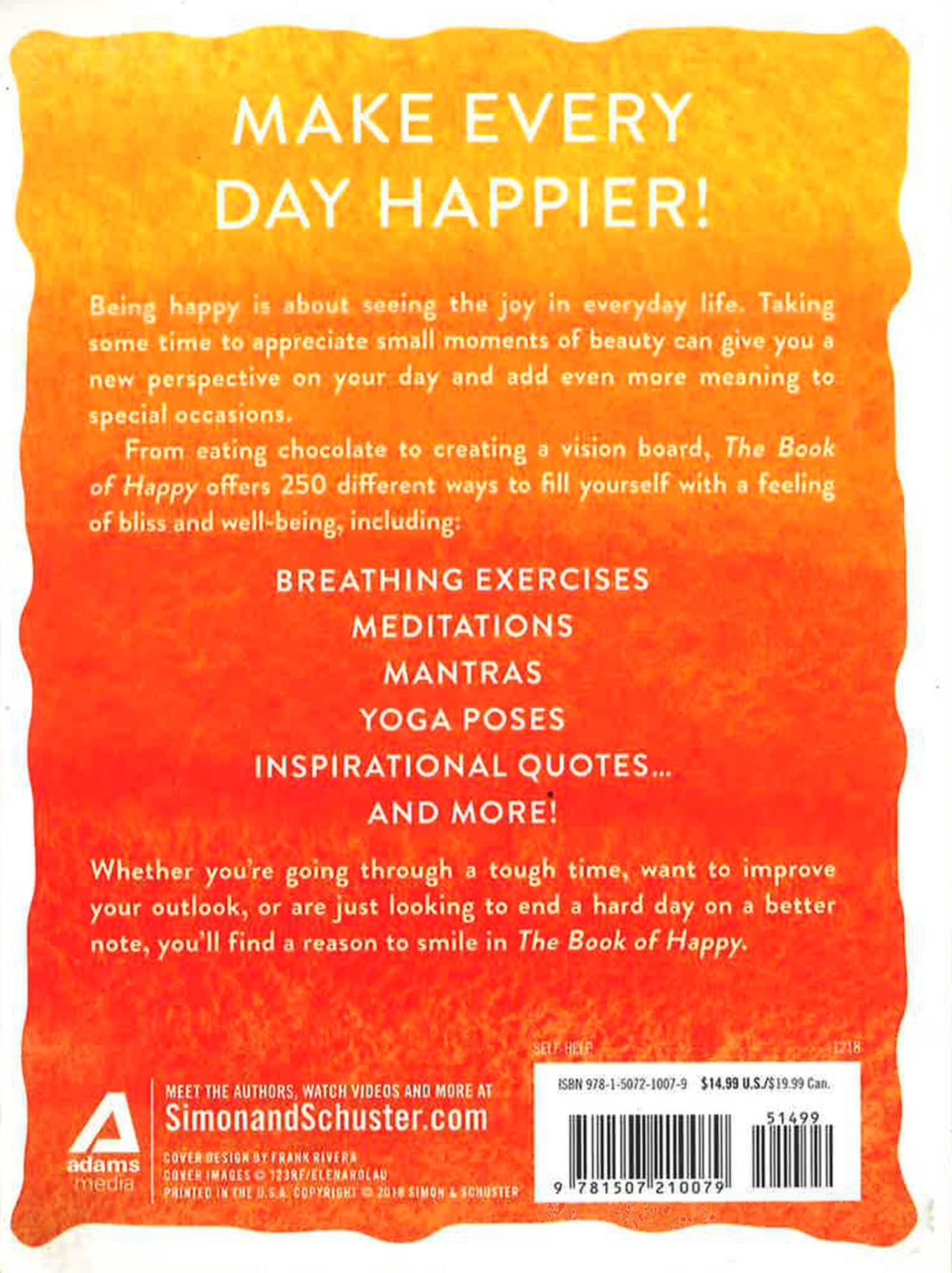 There is perhaps no goal more sought after than happiness: everyone wants to live their life in comfort and peace, and pursue the things that bring them joy. But that's usually easier said than done! Even the most cheerful person can use a little pick-me-up sometimes. While finding contentment in today's chaotic world can be a struggle, The Book of Happy gives you what you need to find bliss, no matter the situation. The book includes over 200 entries to help you to be happy right now, from daily rituals, inspirational quotes, relaxation techniques, happiness hacks and more. With fun suggestions as varied as creating a vision board, to prioritizing yourself, to eating chocolate, you'll find something to make you smile in The Book of Happy, no matter what has you down!
