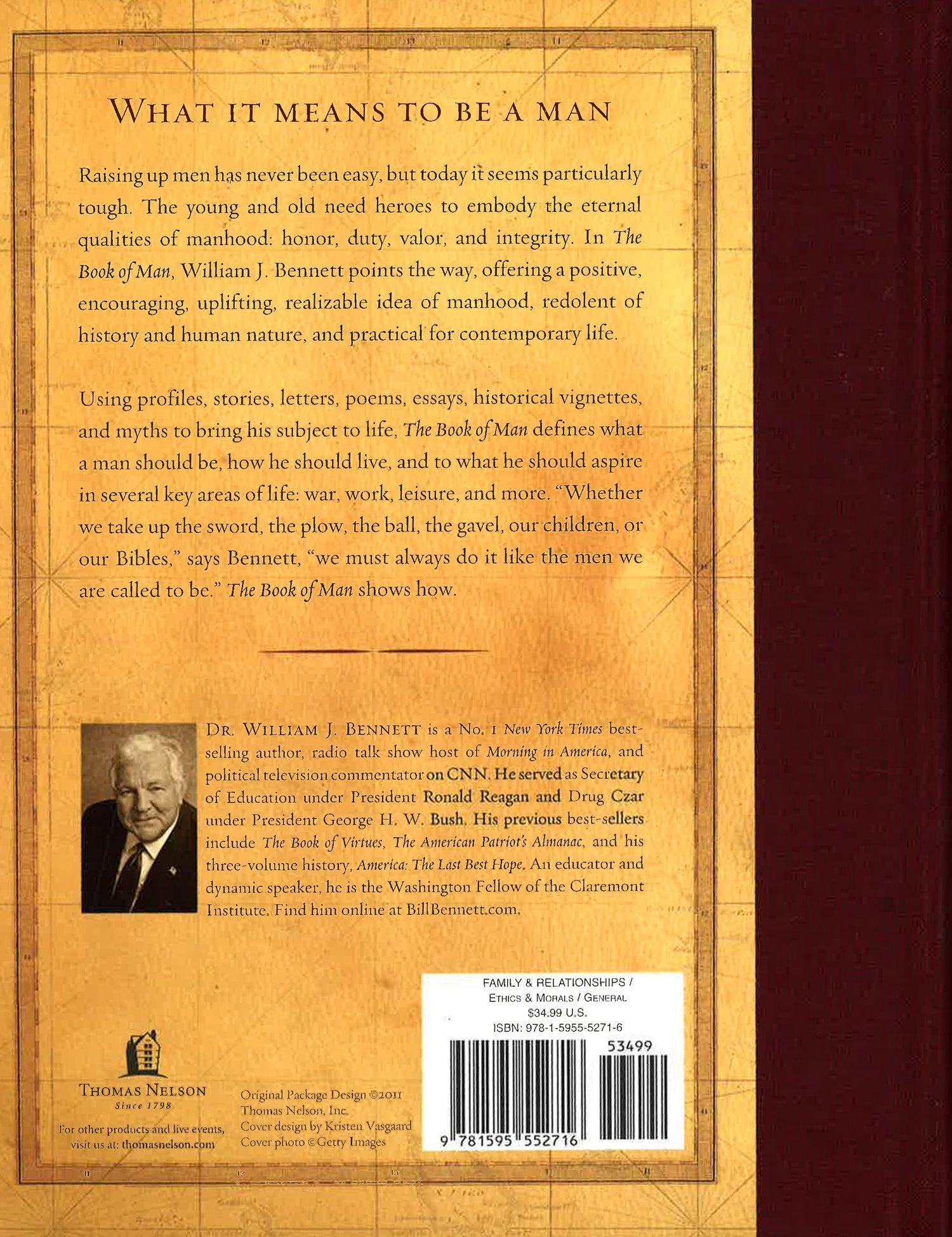 WHAT IT MEANS TO BE A MAN"Raising up men has never been easy, but today is seems particularly tough. The young and old need heroes to embody the eternal qualities of manhood: honor, duty, valor, and integrity. In "The Book of Man," William J. Bennett points the way, offering a positive, encouraging, uplifting, realizable idea of manhood, redolent of history and human nature, and practical for contemporary life.Using profiles, stories, letters, poems, essays, historical vignettes, and myths to bring his subject to life, "The Book of Man" defines what a man should be, how he should live, and to what he should aspire in several key areas of life: war, work, leisure, and more. "Whether we take up the sword, the plow, the ball, the gavel, our children, or our Bibles," says Bennett, "we must always do it like the men we are called to be." "The Book of Man" shows how.