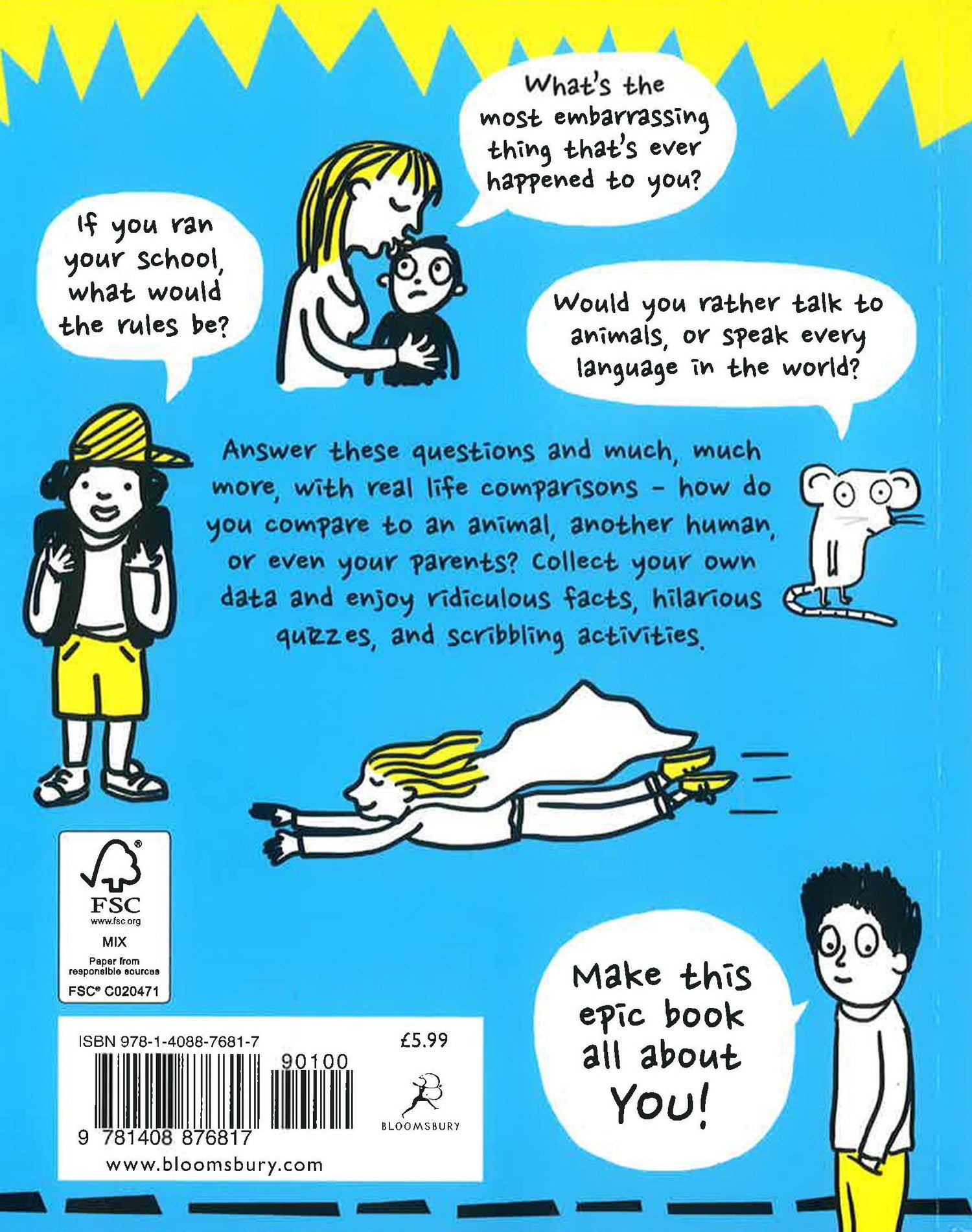Are you ready for another EPIC book from the winner of the Blue Peter Book Award 2016 (Best Book with Facts)? If you ran your school, what would the rules be? Would you rather talk to animals, or speak every language in the world? How fast can you run? Answer these questions and much more, with real life comparisons - how do you compare to an animal, another human, or even your parents? Collect your own data and enjoy silly facts, quizzes, and scrapbook activities. Write, draw, cut-out and fully make this book about you!