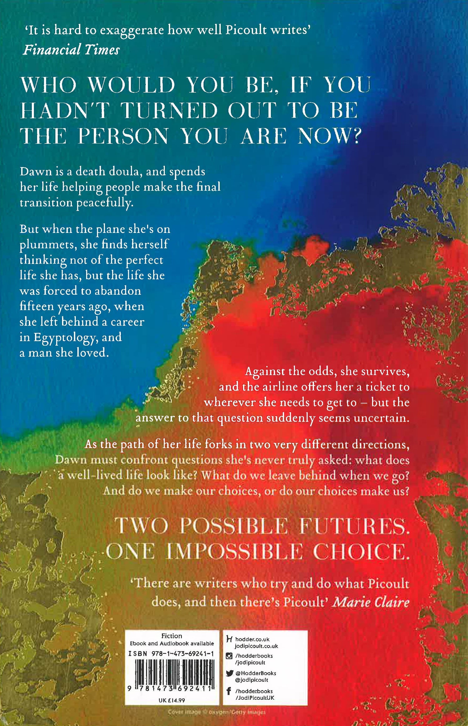 Dawn thinks she knows everything there is to know about dying. As a death doula she helps her clients fix what is left undone so they can peacefully make the final transition. But when her plane plummets from the sky and she thinks she is experiencing the last moments of her life, she is shocked to find that she isn't thinking of her husband or teenage daughter - but of a road she strayed from 15 years earlier, when she turned her back on her PhD studies. Against all odds, Dawn survives, and the airline gives her a free ticket to wherever she needs to get to. in alternating chapters, we see possible choices: Land - returning to her husband, a quantum physicist who studies the possibilities of parallel universes, she is faced with a test to her marriage and a daughter who is struggling with self-image issues. And Water: returning to her studies and the archaeological site she worked on 15 years earlier, where the man she abandoned is about to make the discovery of a lifetime. But time may not be as straightforward as we think. As Dawn explores her possible futures, she is finding out what a well-lived life means, what we leave behind of ourselves when we leave the earth, and who she might have been...