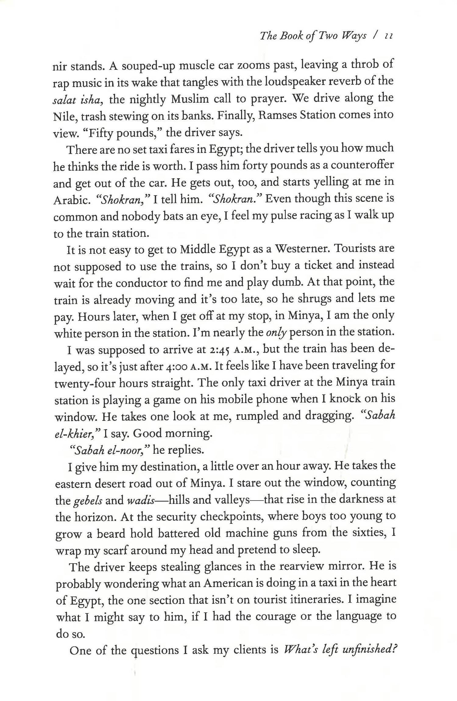 After the crash landing, the airline ensures that the survivors are seen by a doctor, then offers transportation to wherever they want to go. The obvious destination is to fly home, but she could take another path: return to the archaeological site she left years before, reconnect with Wyatt and their unresolved history, and maybe even complete her research on The Book of Two Ways—the first known map of the afterlife.