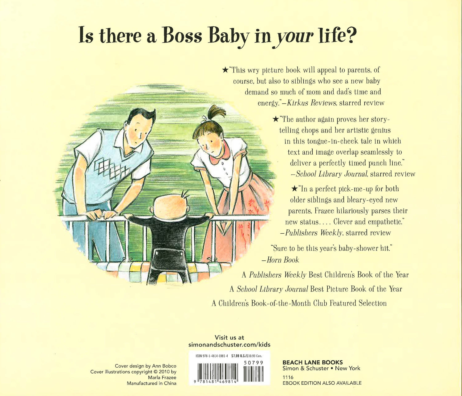A new baby shows everyone who's really in charge in this hilarious picture book from two-time Caldecott Honor recipient Marla Frazee. DreamWorks Animation's The Boss Baby--featuring the voice of Alec Baldwin--is now an Oscar-nominated motion picture inspired by Marla Frazee's beloved picture book! From the moment the baby arrived, it was obvious that he was the boss. The boss baby is used to getting his way--drinks made to order 24/7, a private jet, and meetings around the clock. But when his demands aren't getting proper responses, he has to go to new lengths to achieve the attention he deserves. Marla Frazee brings her signature wit and humor--along with adorable illustrations--to a book that explores the effect of one family's very unusual new arrival. *This book may have a remainder mark