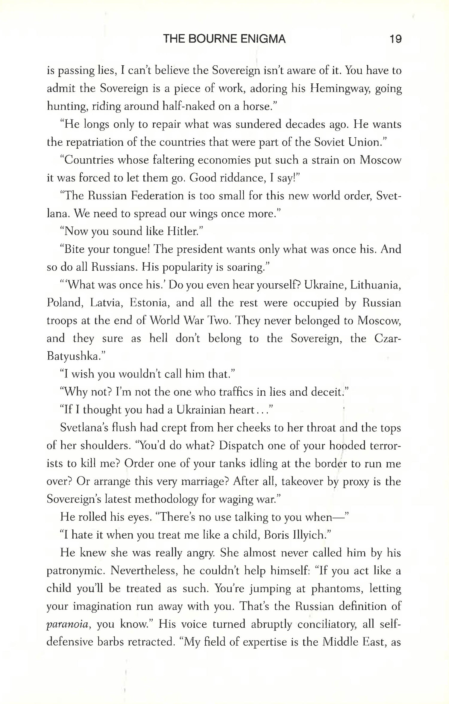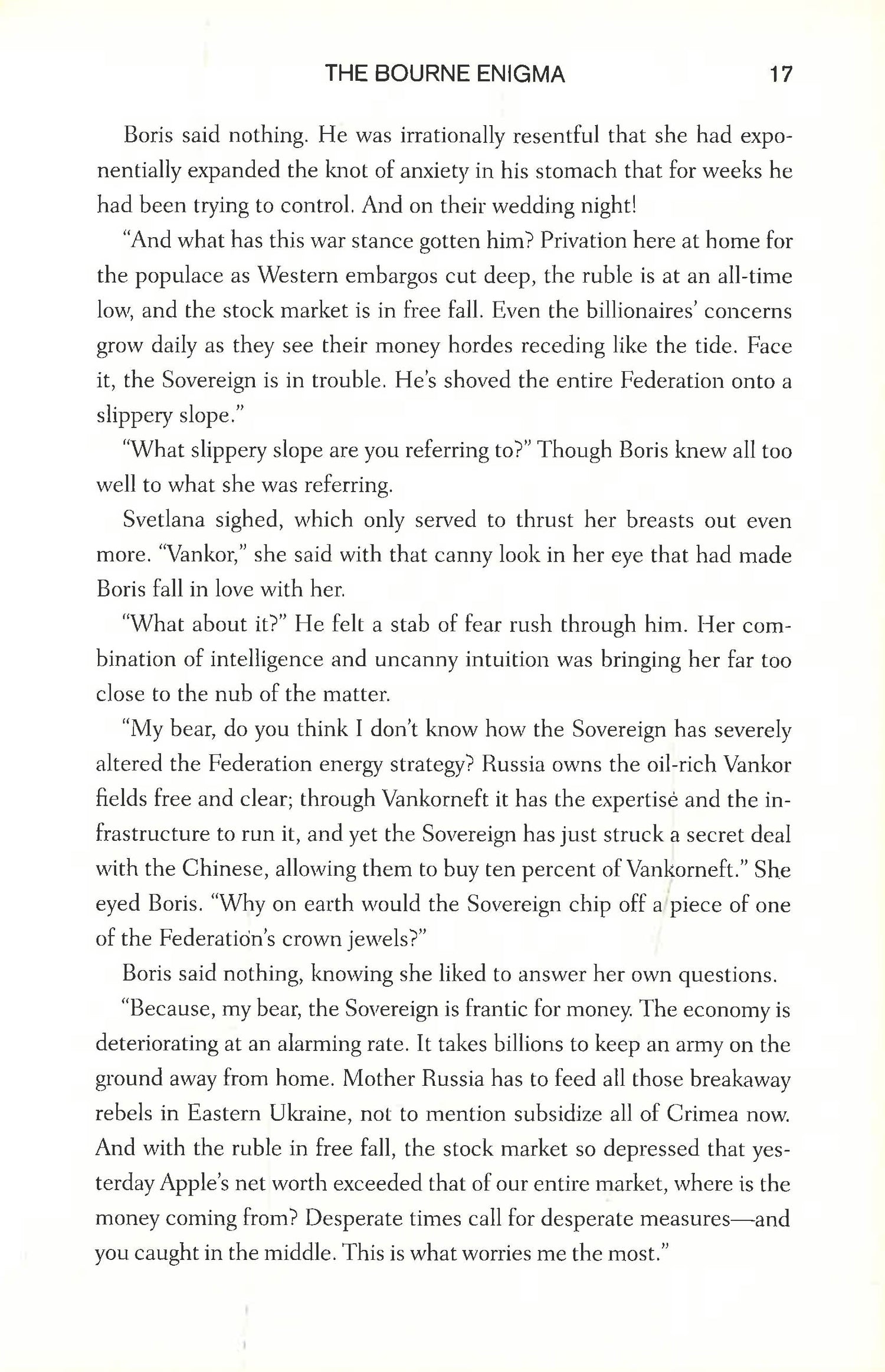 On the eve of Russian general Boris Karpov's wedding, Jason Bourne receives an enigmatic message from his old friend and fellow spymaster. In Moscow, what should be a joyous occasion turns bloody and lethal. Now Bourne is the only one who can decipher Karpov's cryptogram. He discovers that Karpov has betrayed his sovereign to warn Bourne of a crippling disaster about to be visited on the world. Bourne has only four days to discover the nature of the disaster and stop it.The trail Karpov has been following leads Bourne to Cairo and the doorstep of Ivan Borz, the elusive international arms dealer infamous for hiding behind a never-ending series of false identities, a man Bourne has been hunting ever since he abducted former Treadstone director Soraya Moore and her two-year-old daughter and brutally murdered Soraya's husband.Bourne must travel to war-torn Syria and then Cyprus as he chases the astonishing truth. The clock is ticking, and Bourne has less than four days to solve Karpov's riddle--and hunt down Borz--if he hopes to prevent a cataclysmic international war . . .