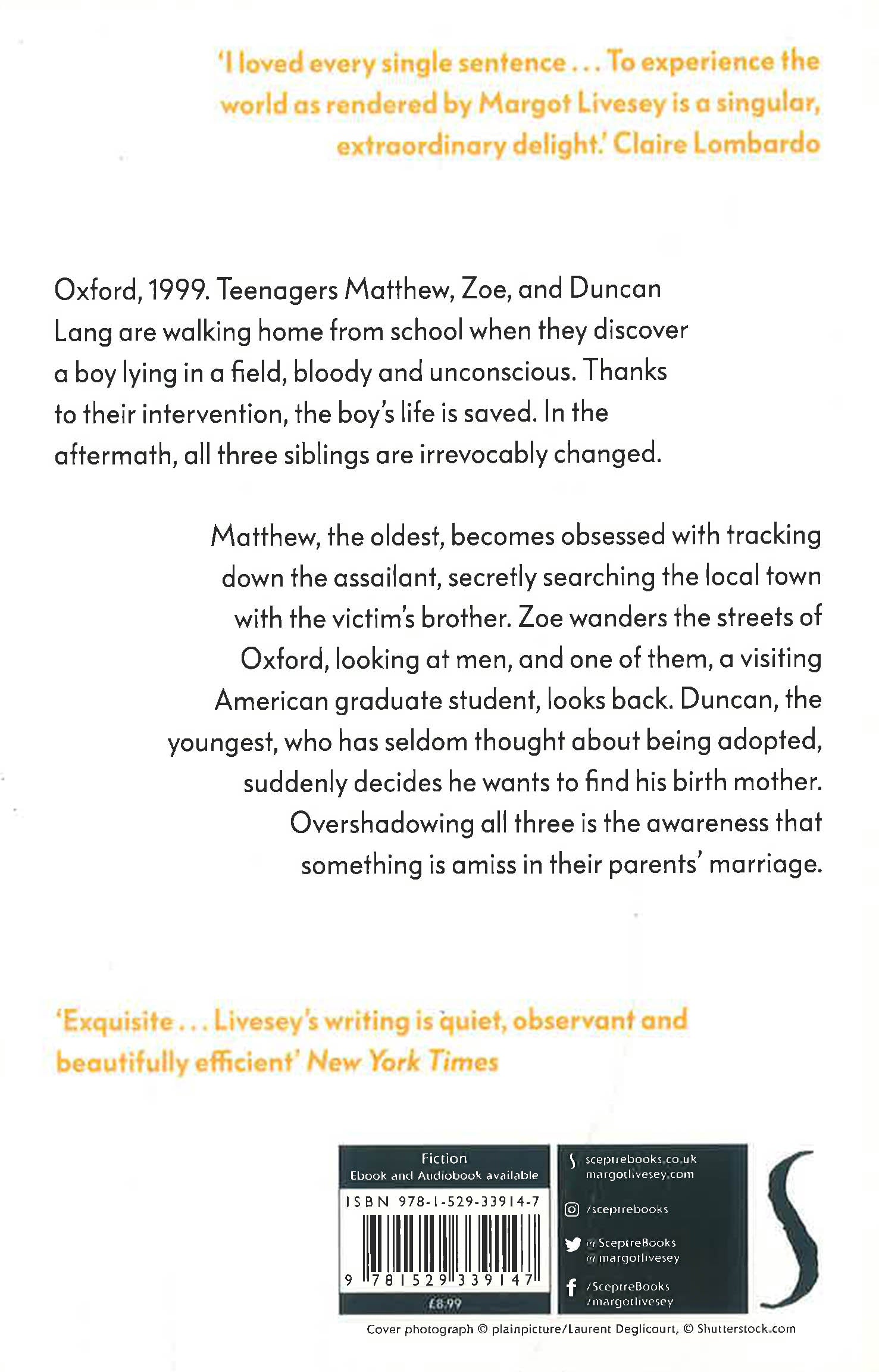 Matthew, the oldest, becomes obsessed with tracking down the assailant, secretly searching the local town with the victim's brother. Zoe wanders the streets of Oxford, looking at men, and one of them, a visiting American graduate student, looks back. Duncan, the youngest, who has seldom thought about being adopted, suddenly decides he wants to find his birth mother. Overshadowing all three is the awareness that something is amiss in their parents' marriage.
