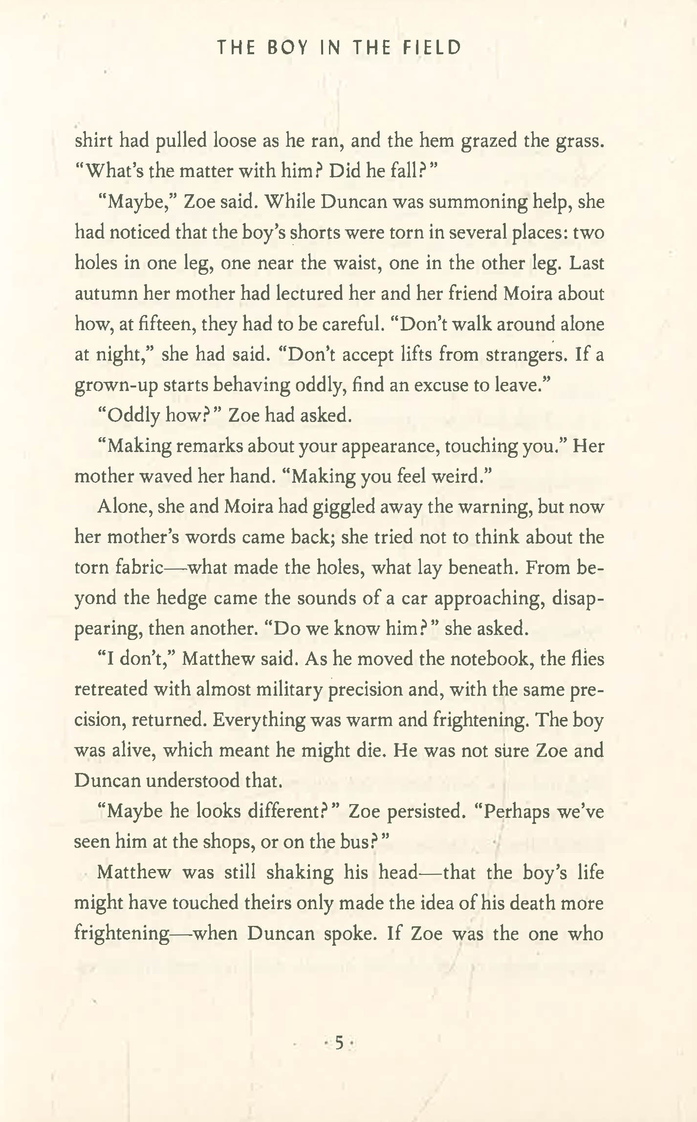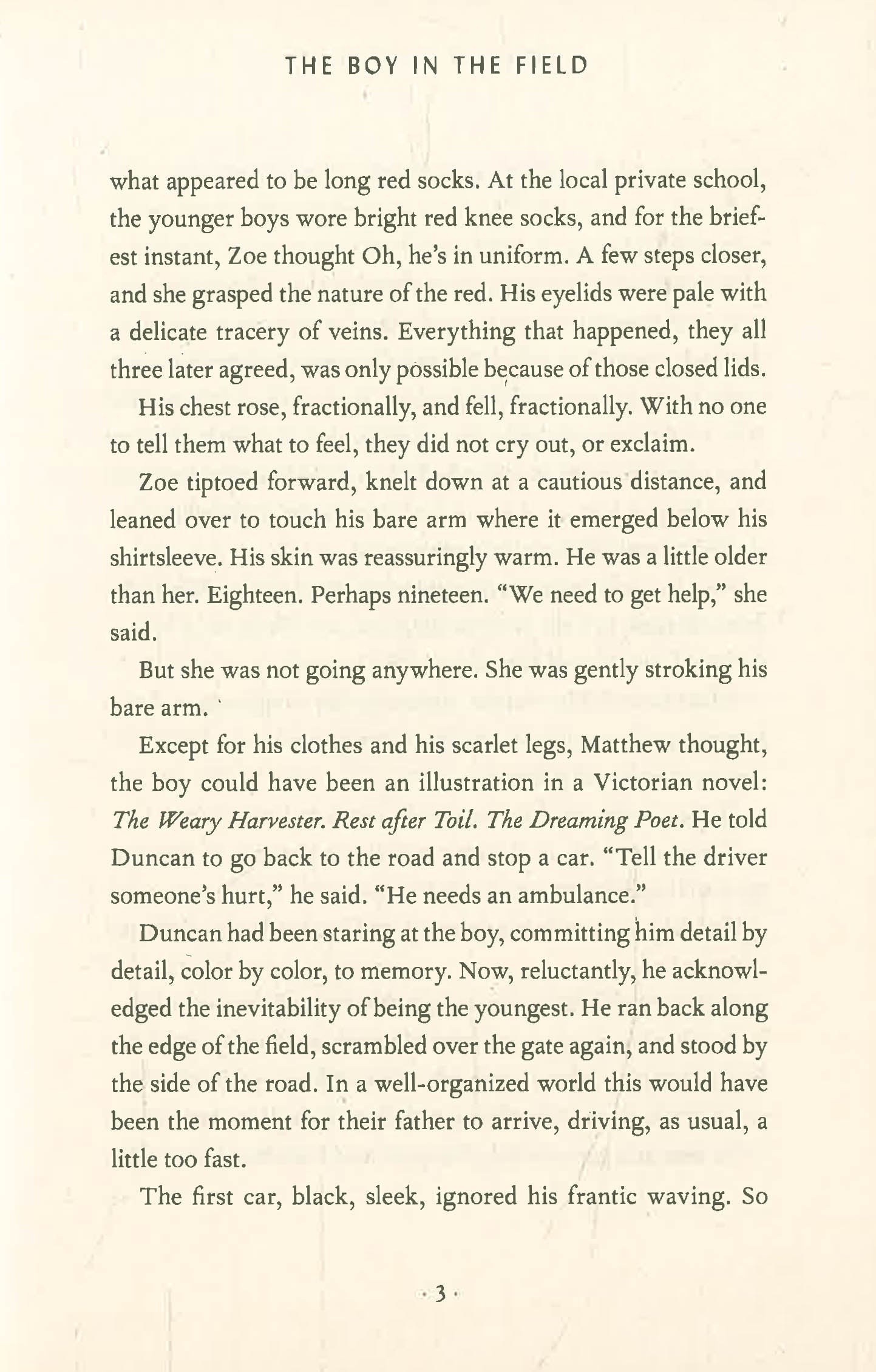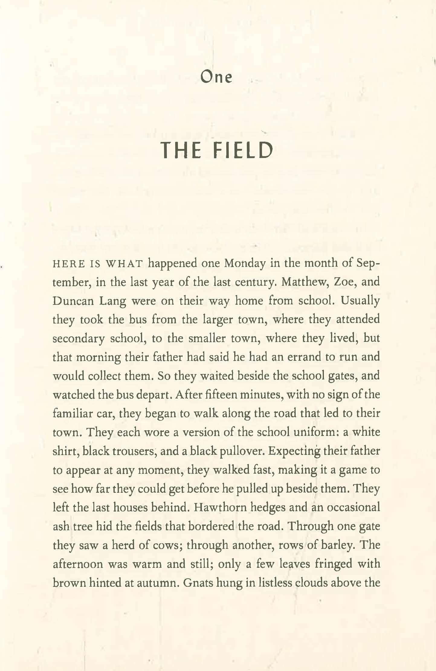 One September afternoon in 1999, teenagers Matthew, Zoe, and Duncan Lang are walking home from school when they discover a boy lying in a field, bloody and unconscious. Thanks to their intervention, the boy's life is saved. In the aftermath, all three siblings are irrevocably changed.