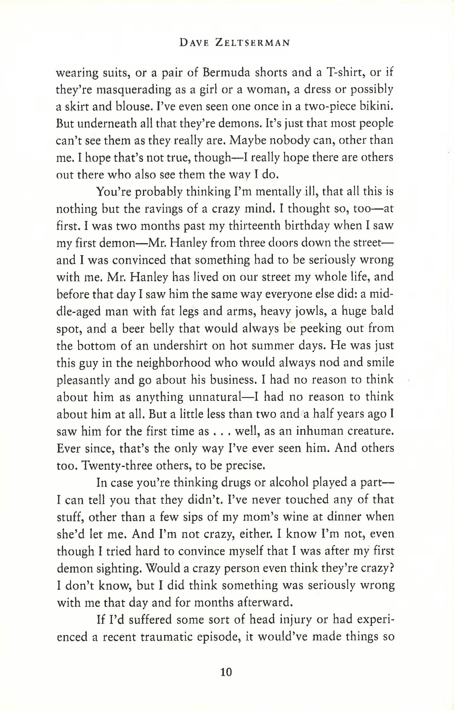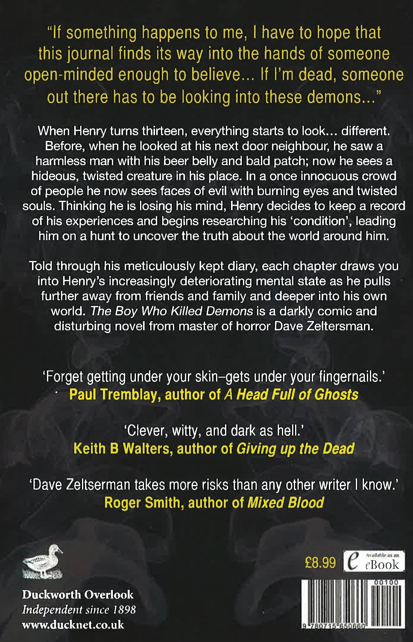 So begins the latest thriller by horror master Dave Zeltserman. The setting is quiet Newton, Massachusetts, where nothing ever happens. Nothing, that is, until two months after Henry Dudlow's thirteenth birthday when his neighbour, Mr. Hanley, suddenly starts to look ...different. While everyone else sees a balding man with a beer belly, Henry suddenly sees a nasty, bilious, rage-filled demon.
