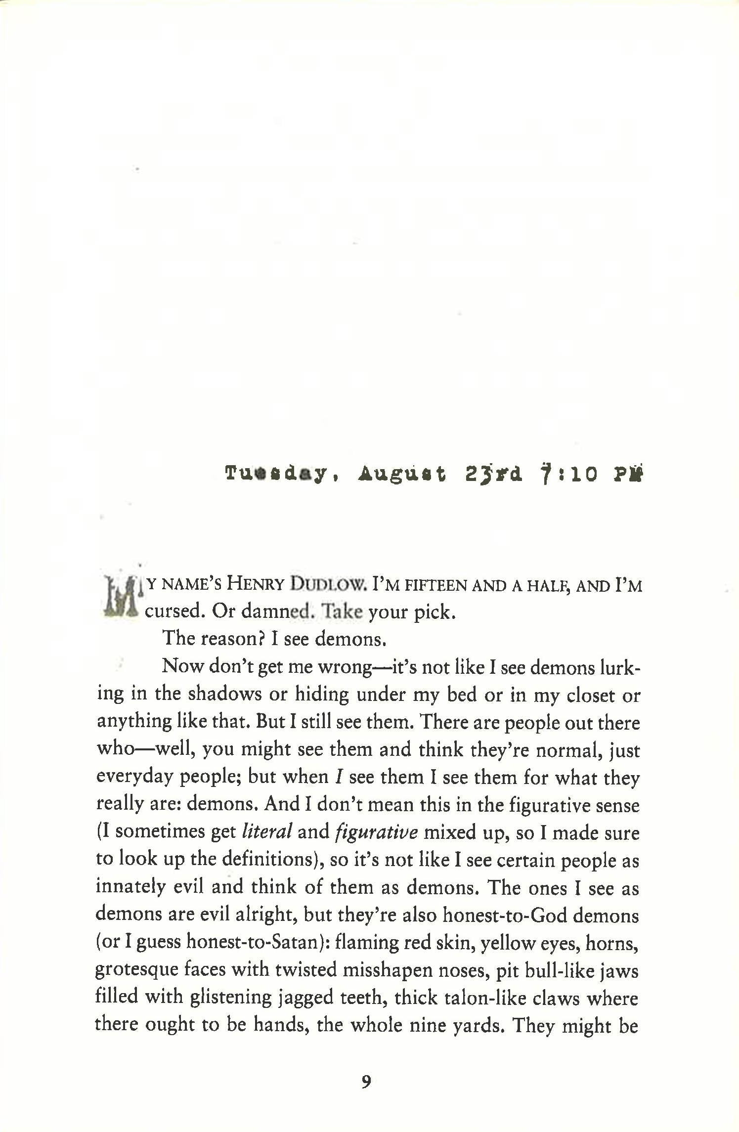 Once Henry catches onto the real Mr. Hanley, he starts to see demons all around him, and his boring, adolescent life is transformed. There's no more time for friends or sports, or the lovely Sally Freeman-Henry must work his way through ancient texts and hunt down the demons before they kill any more innocent children. And if hunting demons is hard at any age, it's borderline impossible when your parents are on your case, and your grades are getting worse, and you can't tell anyone about your mission.