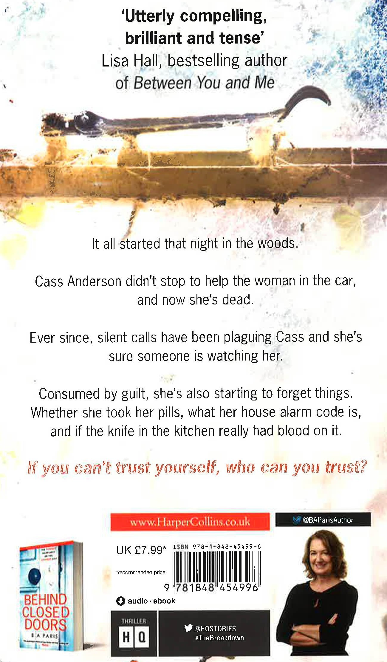 From the million-copy bestselling author, B A Paris 'A psychological page-turner' Good Housekeeping 'Gripping!' Woman 'You'll race through to discover what's happening!' Prima If you can't trust yourself, who can you trust? It all started that night in the woods. Cass Anderson didn't stop to help the woman in the car, and now she's dead. Ever since, silent calls have been plaguing Cass and she's sure someone is watching her. Consumed by guilt, she's also starting to forget things. Whether she took her pills, what her house alarm code is - and if the knife in the kitchen really had blood on it. Praise for The Breakdown: 'A psychological page-turner' Good Housekeeping 'Gripping!' Woman 'You'll race through to discover what's happening!' Prima 'You'll be unable to rest until you've followed the twists and turns to an ending you didn't forsee' Daily Express 'B A Paris has done it again! The Breakdown is a page turning thriller that will leave you questioning the family you love, the friends you trust, and even your own mind' Wendy Walker, author of All is Not Forgotten 'Utterly compelling, brilliant and tense' Lisa Hall, author of Between You and Me