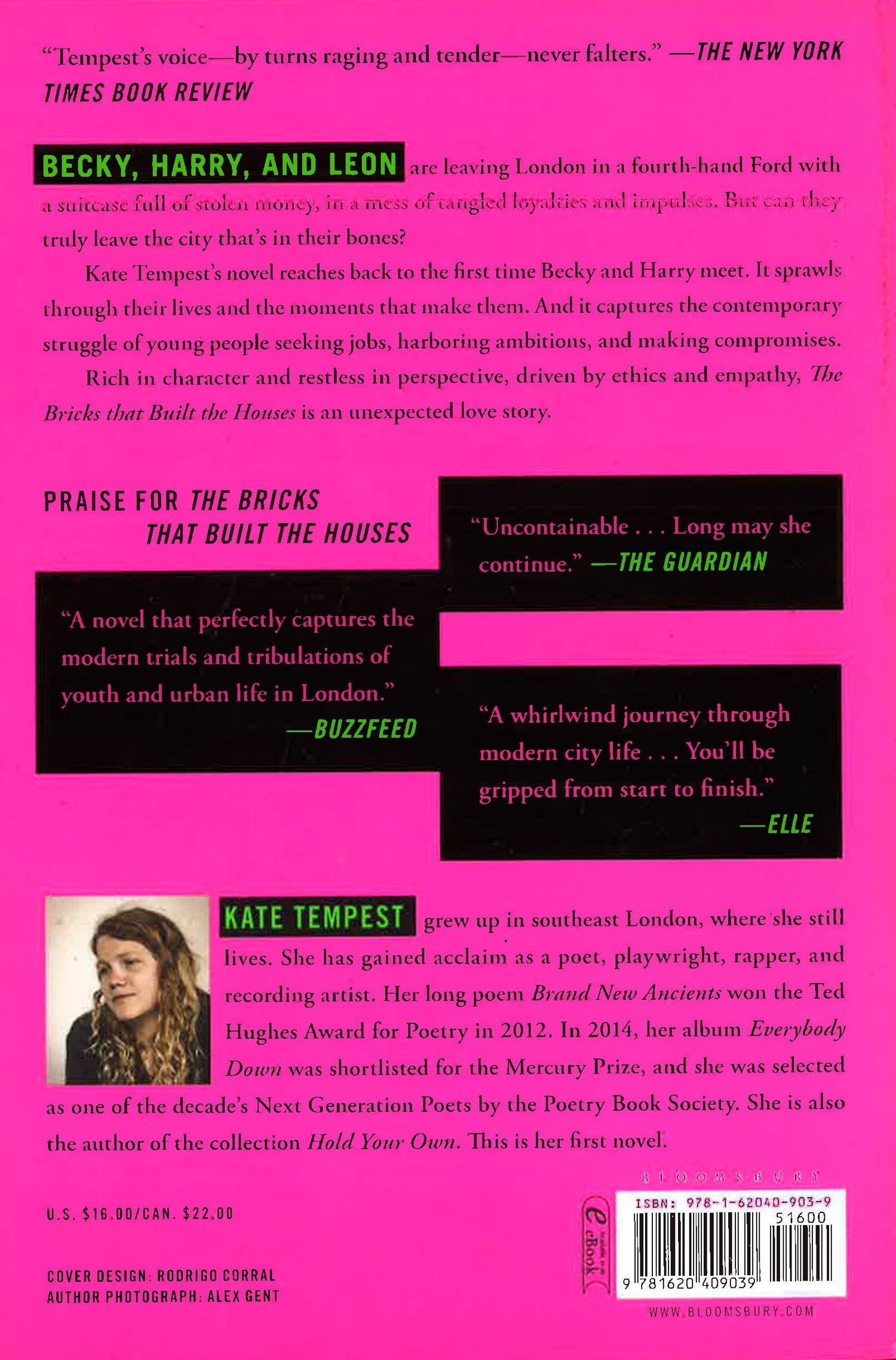 Becky, Harry, and Leon are leaving London in a fourth-hand Ford with a suitcase full of stolen money, in a mess of tangled loyalties and impulses. But can they truly leave the city that's in their bones?Kate Tempest's novel reaches back through time--through tensely quiet dining rooms and crassly loud clubs--to the first time Becky and Harry meet. It sprawls through their lives and those they touch--of their families and friends and faces on the street--revealing intimacies and the moments that make them. And it captures the contemporary struggle of urban life, of young people seeking jobs or juggling jobs, harboring ambitions and making compromises.The Bricks that Built the Houses is an unexpected love story. It's about being young, but being part of something old. It's about how we become ourselves, and how we effect our futures. Rich in character and restless in perspective, driven by ethics and empathy, it asks--and seeks to answer--how best to live with and love one another.