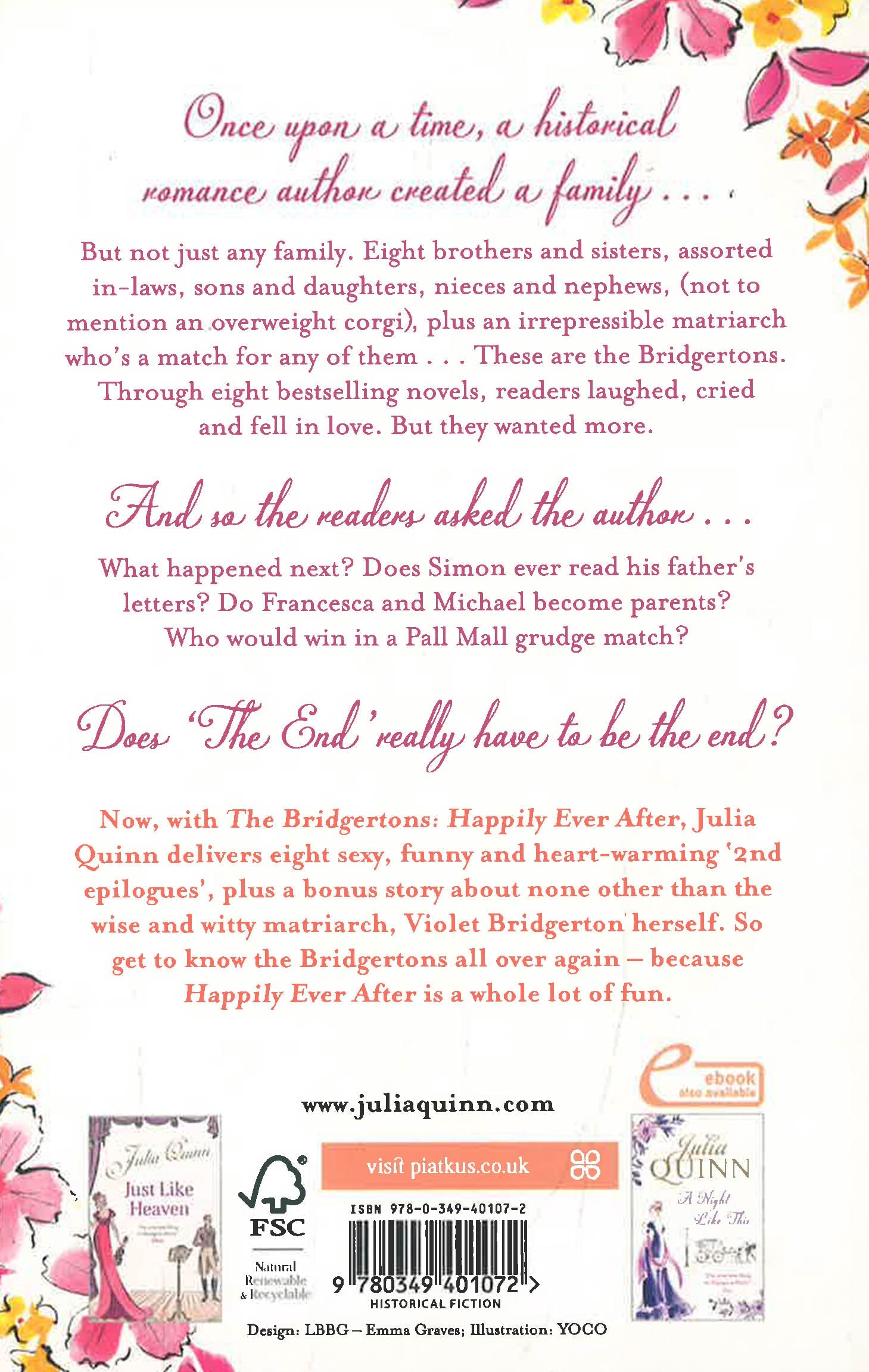 New York Times bestselling author Julia Quinn presents a collection of 'second epilogues' to her bestselling Bridgerton series, now a series created by Shonda Rhimes for Netflix, and also includes a bonus novella, 'Violet in Bloom', about the Bridgerton matriarch.Once upon a time, a historical romance author created a family...But not just any family. Eight brothers and sisters, assorted in-laws, sons and daughters, nieces and nephews, (not to mention an overweight corgi), plus an irrepressible matriarch who's a match for any of them... These are the Bridgertons: less a family than a force of nature. Through eight bestselling novels, readers laughed, cried, and fell in love. But they wanted more.And so the readers asked the author...What happened next? Does Simon ever read his father's letters? Do Francesca and Michael become parents? Who would win in a Pall Mall grudge match?Does 'The End' really have to be the end?Now, with The Bridgertons: Happily Ever After, Julia Quinn delivers eight sexy, funny and heart-warming '2nd epilogues', plus a bonus story ('Violet in Bloom') about none other than the wise and witty Violet Bridgerton herself. Get to know the Bridgertons all over again - because Happily Ever After is a whole lot of fun . . .