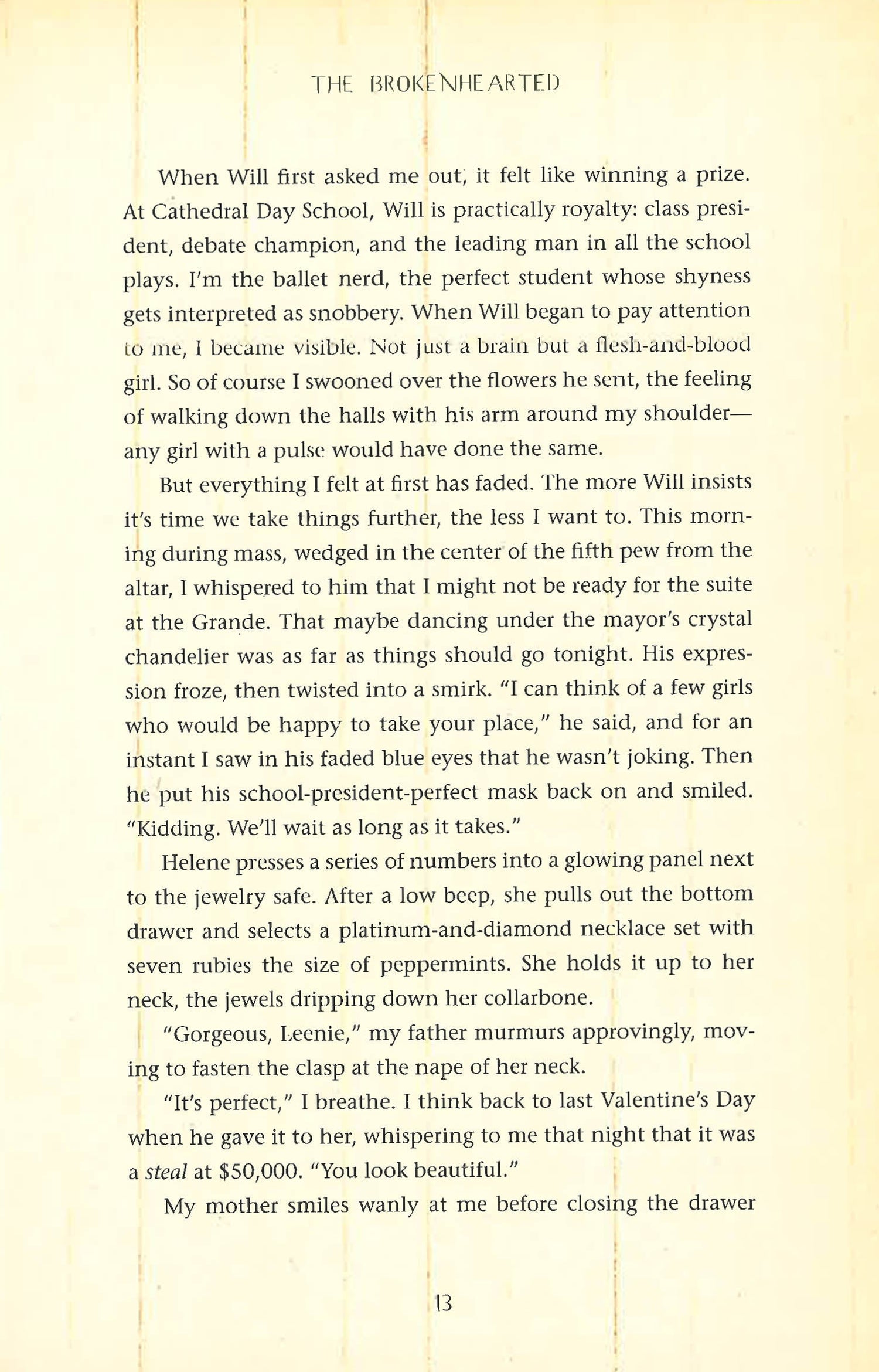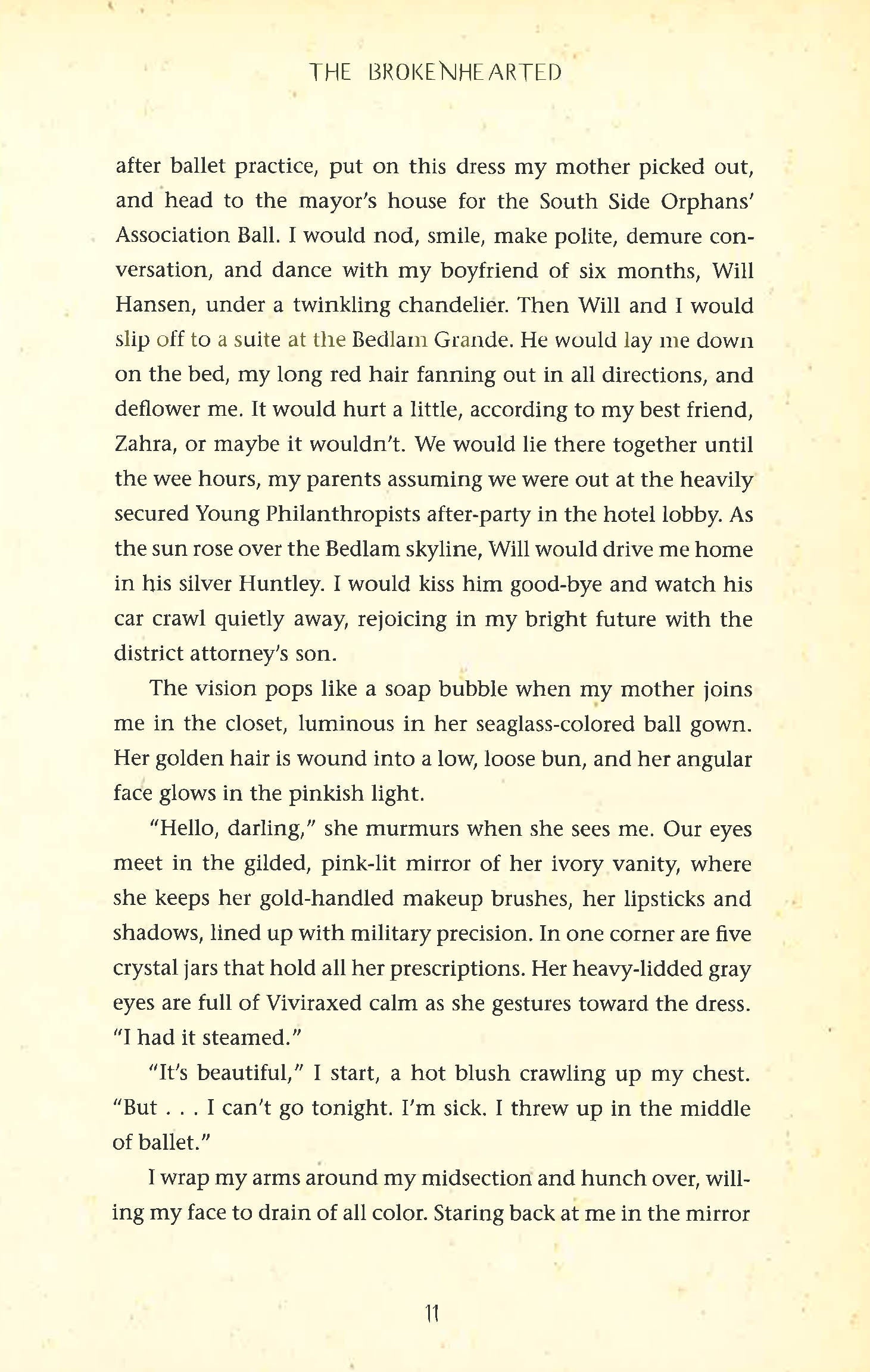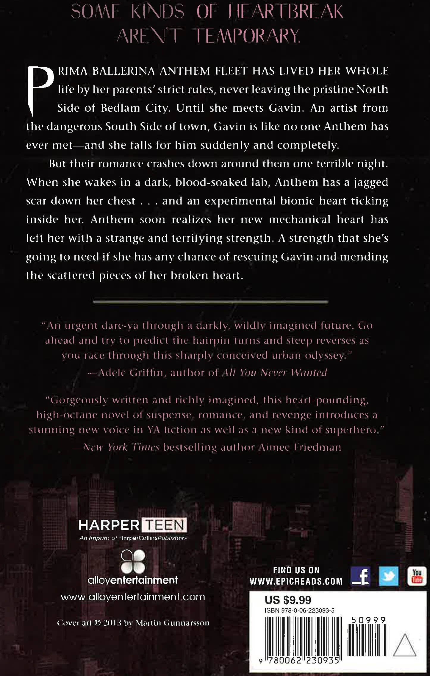 Some kinds of Heartbreak aren't temporary. Prima ballerina Anthem Fleet has lived her whole life by her parents' strict rules, never leaving the pristine North Side of Bedlam City. Until she meets Gavin. An artist from the dangerous South Side of town, Gavin is like no one Anthem has ever met--and she falls for him suddenly and completely. But their romance crashes down around them one terrible night. When she wakes in a dark, blood-soaked lab, Anthem has a jagged scar down her chest . . . and an experimental bionic heart ticking inside her. Anthem soon realizes her new mechanical heart has left her with a strange and terrifying strength. A strength that she's going to need if she has any chance of rescuing Gavin and mending the scattered pieces of her broken heart.