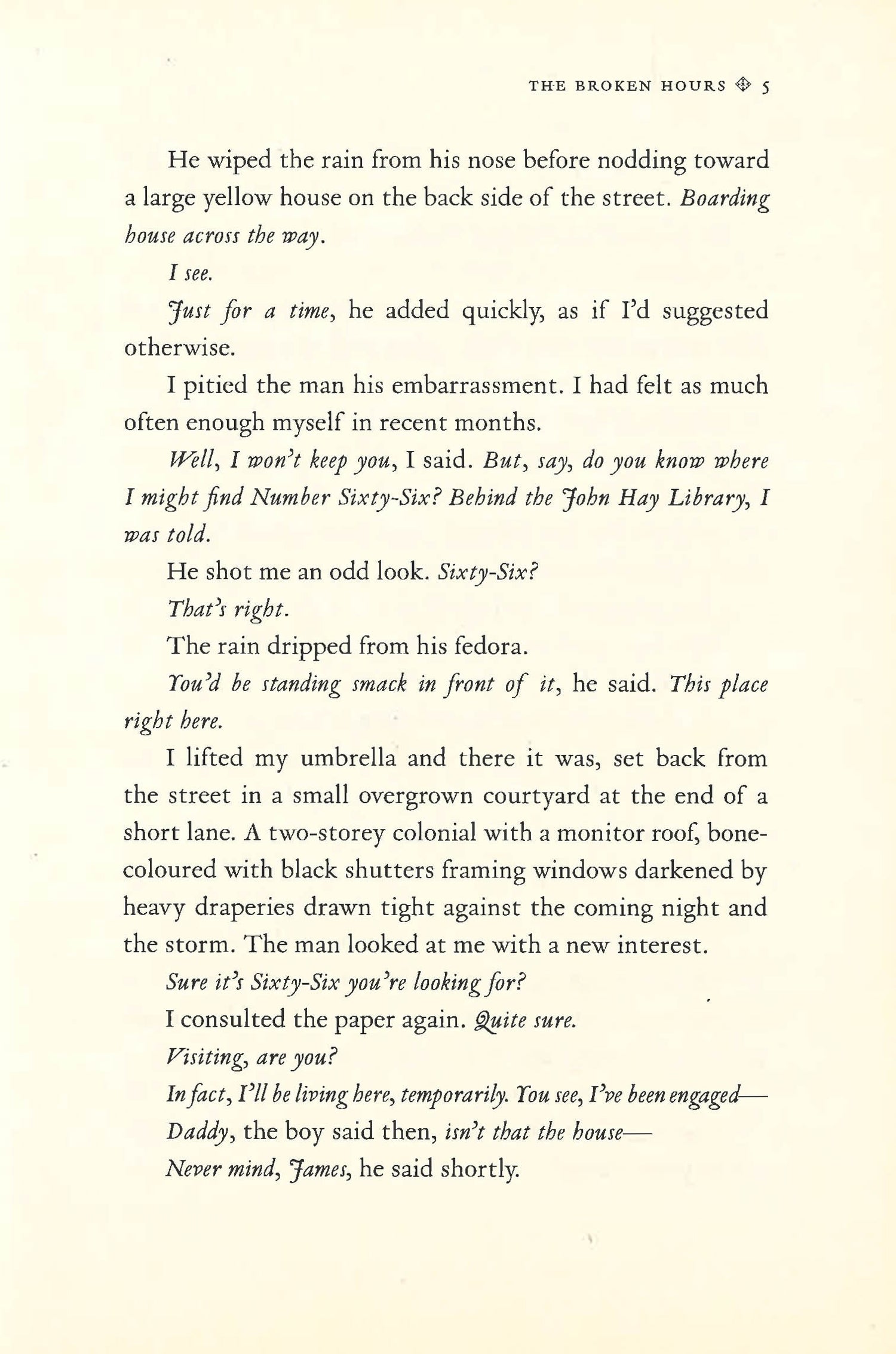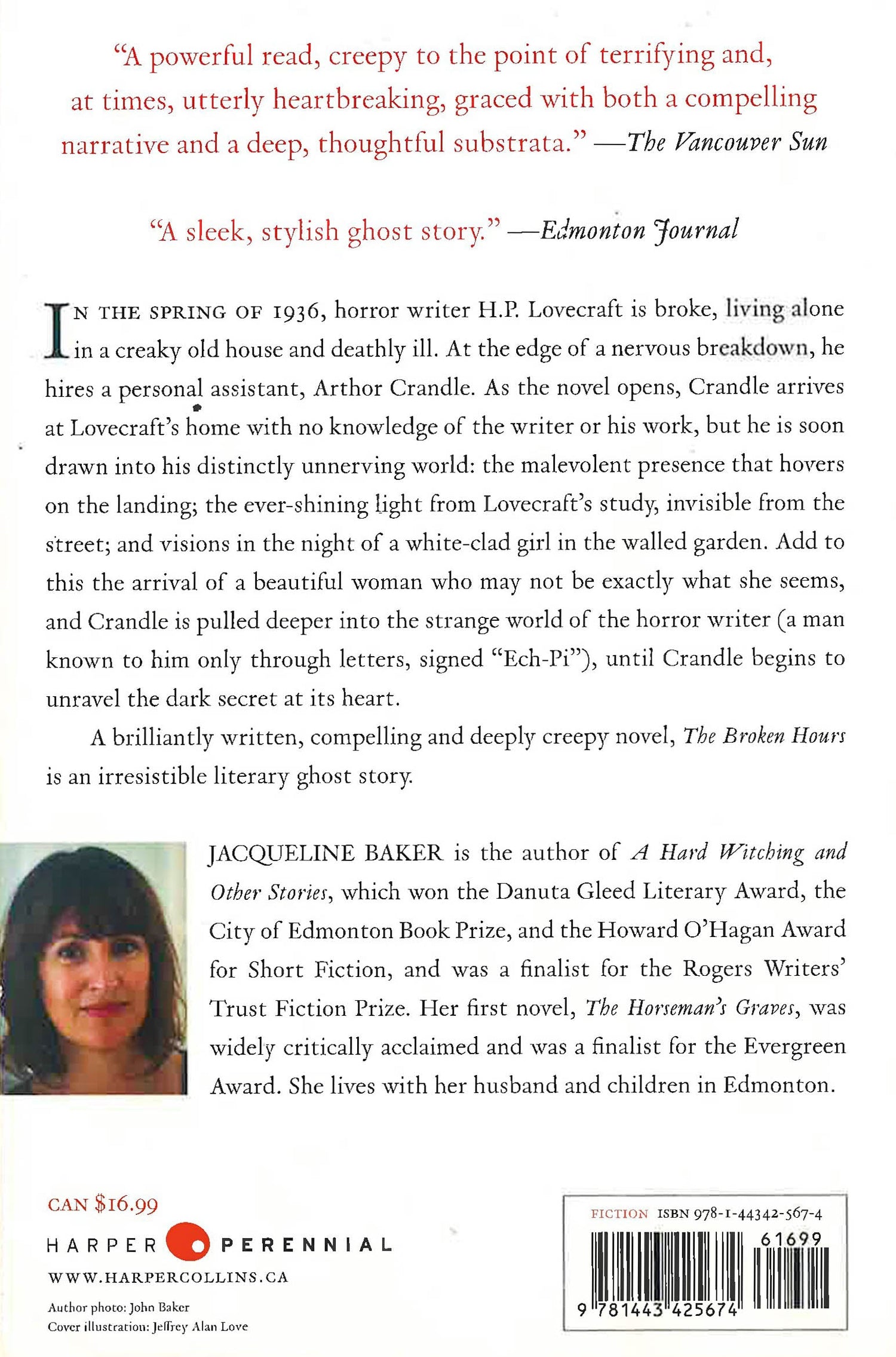 In the spring of 1936, horror writer H.P. Lovecraft is broke, living alone in a creaky old house and deathly ill. At the edge of a nervous breakdown, he hires a personal assistant, Arthor Crandle. As the novel opens, Crandle arrives at Lovecraft’s home with no knowledge of the writer or his work but is soon drawn into his distinctly unnerving world: the malevolent presence that hovers on the landing; the ever-shining light from Lovecraft’s study, invisible from the street; and visions in the night of a white-clad girl in the walled garden. Add to this the arrival of a beautiful woman who may not be exactly what she seems, and Crandle is pulled deeper into the strange world of the horror writer (a man known to Crandle only through letters, signed "Ech-Pi"), until Crandle begins to unravel the dark secret at its heart.A brilliantly written, compelling and deeply creepy novel, The Broken Hours is an irresistible literary ghost story.