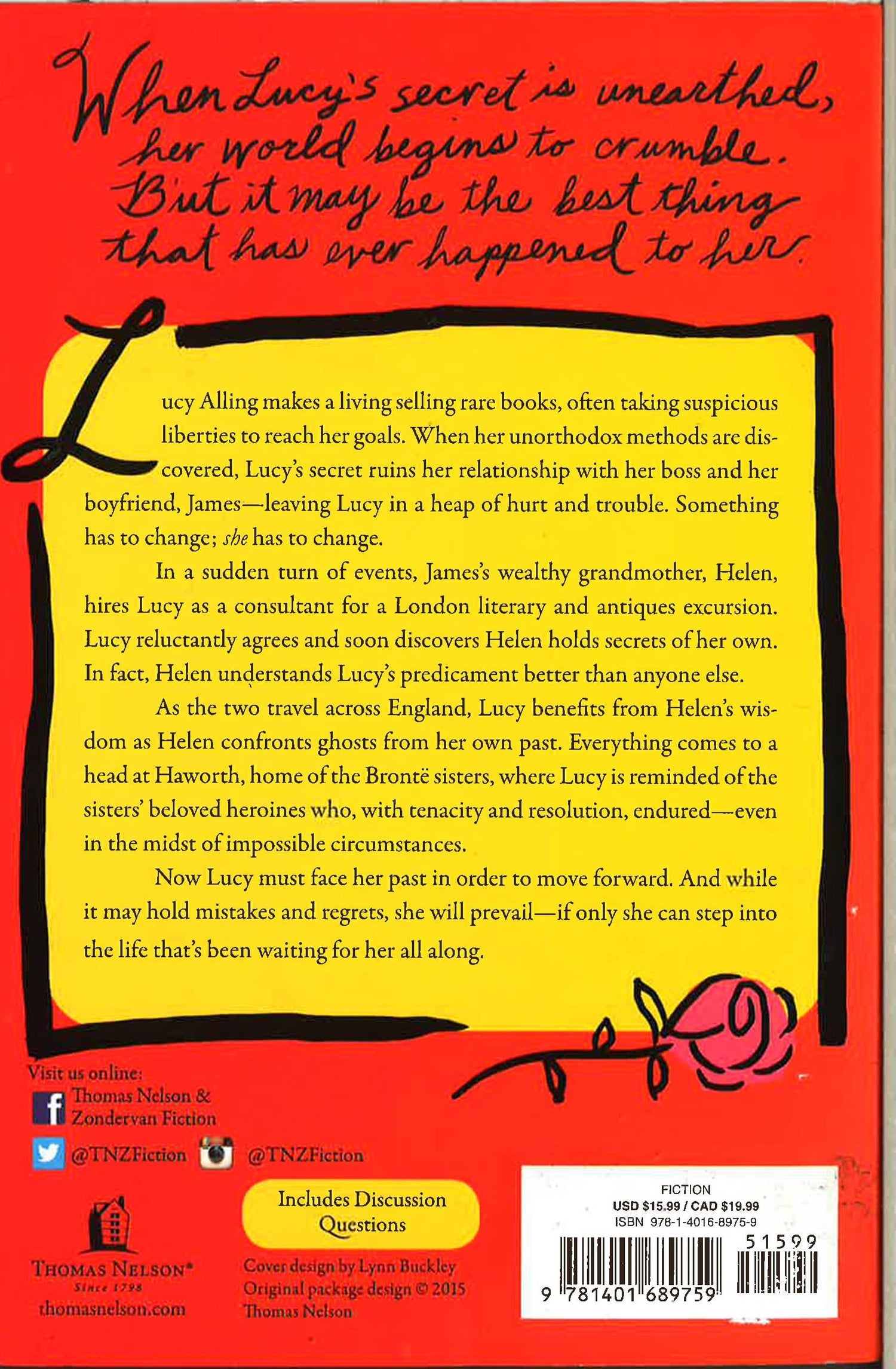 Lucy Alling makes a living selling rare books, often taking suspicious liberties to reach her goals. When her unorthodox methods are discovered, Lucy's secret ruins her relationship with her boss and her boyfriend, James--leaving Lucy in a heap of hurt and trouble. Something has to change; she has to change. In a sudden turn of events, James's wealthy grandmother, Helen, hires Lucy as a consultant for a London literary and antiques excursion. Lucy reluctantly agrees and soon discovers Helen holds secrets of her own. In fact, Helen understands Lucy's predicament better than anyone else. As the two travel across England, Lucy benefits from Helen's wisdom as Helen confronts ghosts from her own past. Everything comes to a head at Haworth, home of the Bronte sisters, where Lucy is reminded of the sisters' beloved heroines who, with tenacity and resolution, endured--even in the midst of impossible circumstances. Now Lucy must face her past in order to move forward. And while it may hold mistakes and regrets, she will prevail--if only she can step into the life that's been waiting for her all along.