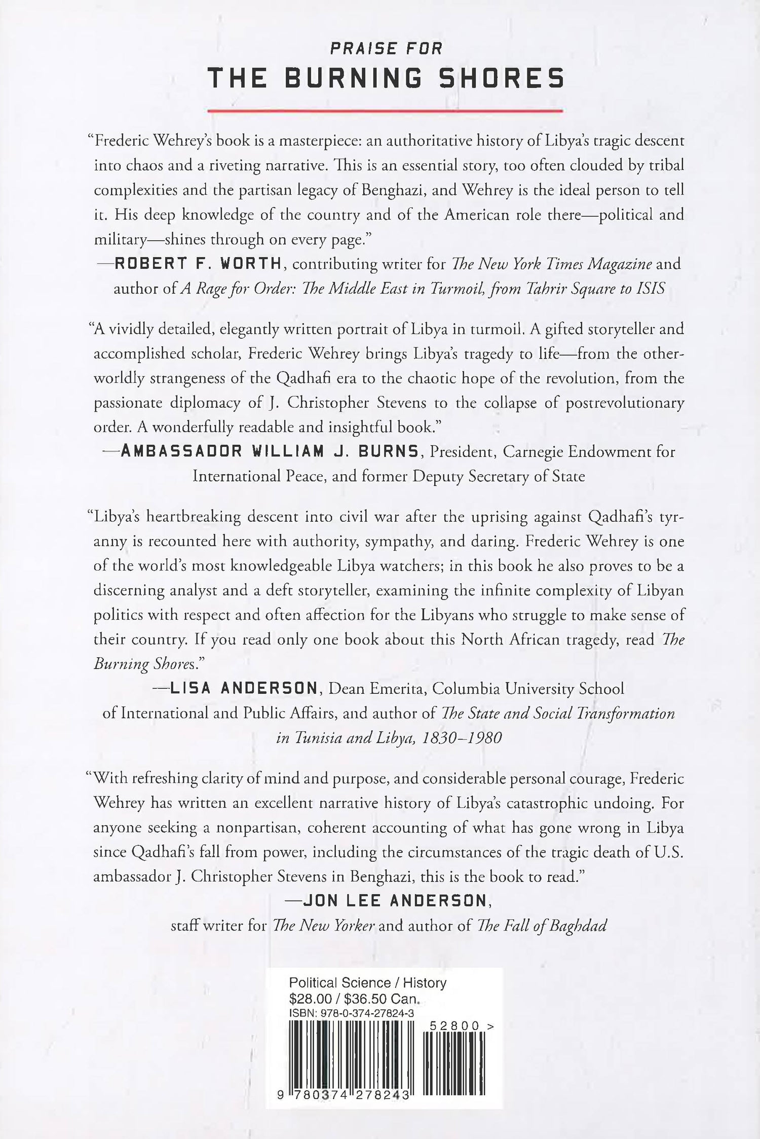 The death of Colonel Muammar Qadhafi freed Libya from forty-two years of despotic rule, raising hopes for a new era. But in the aftermath, the country descended into bitter rivalries and civil war, paving the way for the Islamic State and a catastrophic migrant crisis. In a fast-paced narrative that blends frontline reporting, analysis, and history, Frederic Wehrey tells the story of what went wrong. An Arabic-speaking Middle East scholar, Wehrey interviewed the key actors in Libya and paints vivid portraits of lives upended by a country in turmoil: the once-hopeful activists murdered or exiled, revolutionaries transformed into militia bosses or jihadist recruits, an aging general who promises salvation from the chaos in exchange for a return to the old authoritarianism. He traveled where few Westerners have gone, from the shattered city of Benghazi, birthplace of the revolution, to the lawless Sahara, to the coastal stronghold of the Islamic State in Qadhafi’s hometown of Sirte. He chronicles the American and international missteps after the dictator’s death that hastened the country’s unraveling. Written with bravura, based on daring reportage, and informed by deep knowledge, The Burning Shores is the definitive account of Libya’s fall.