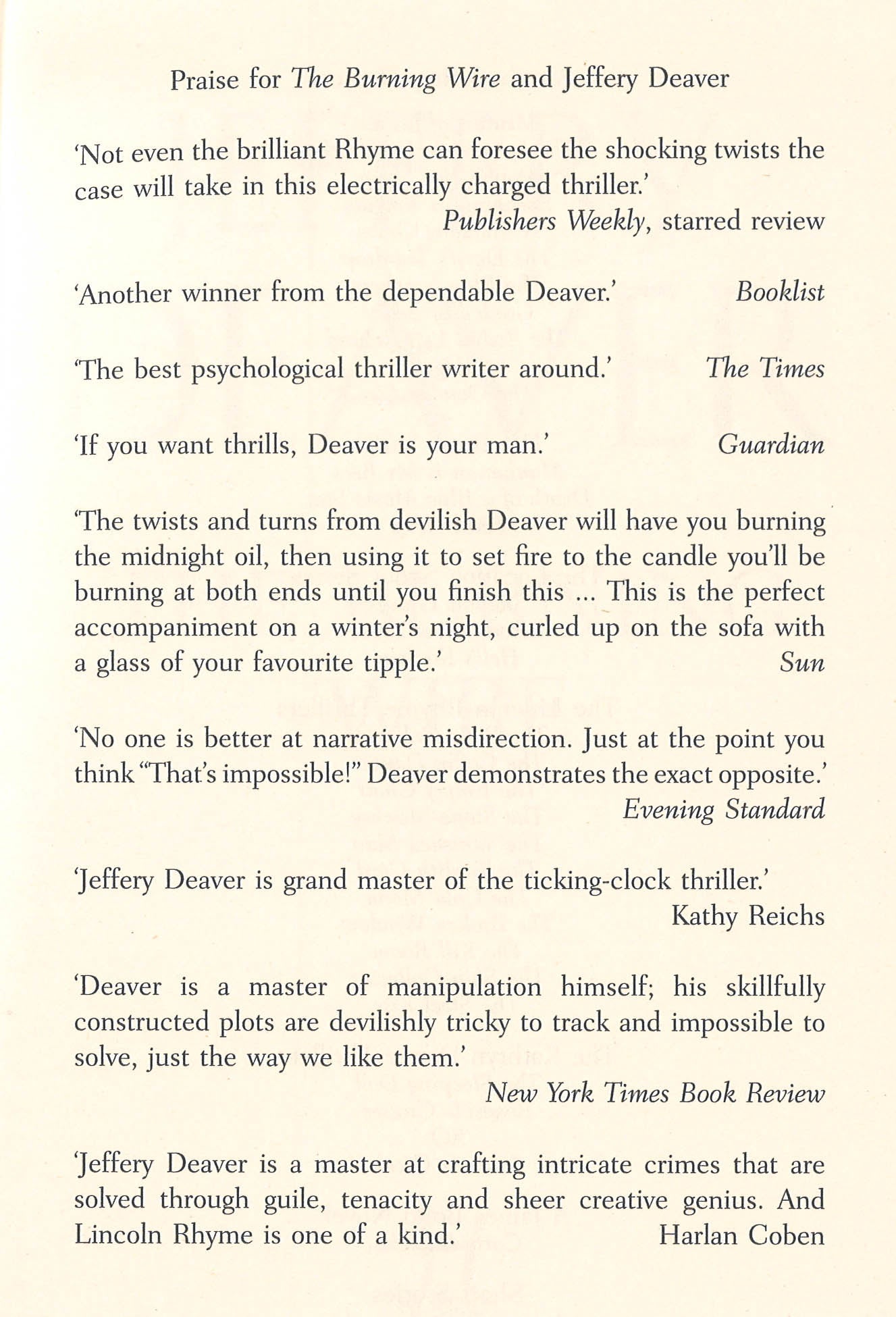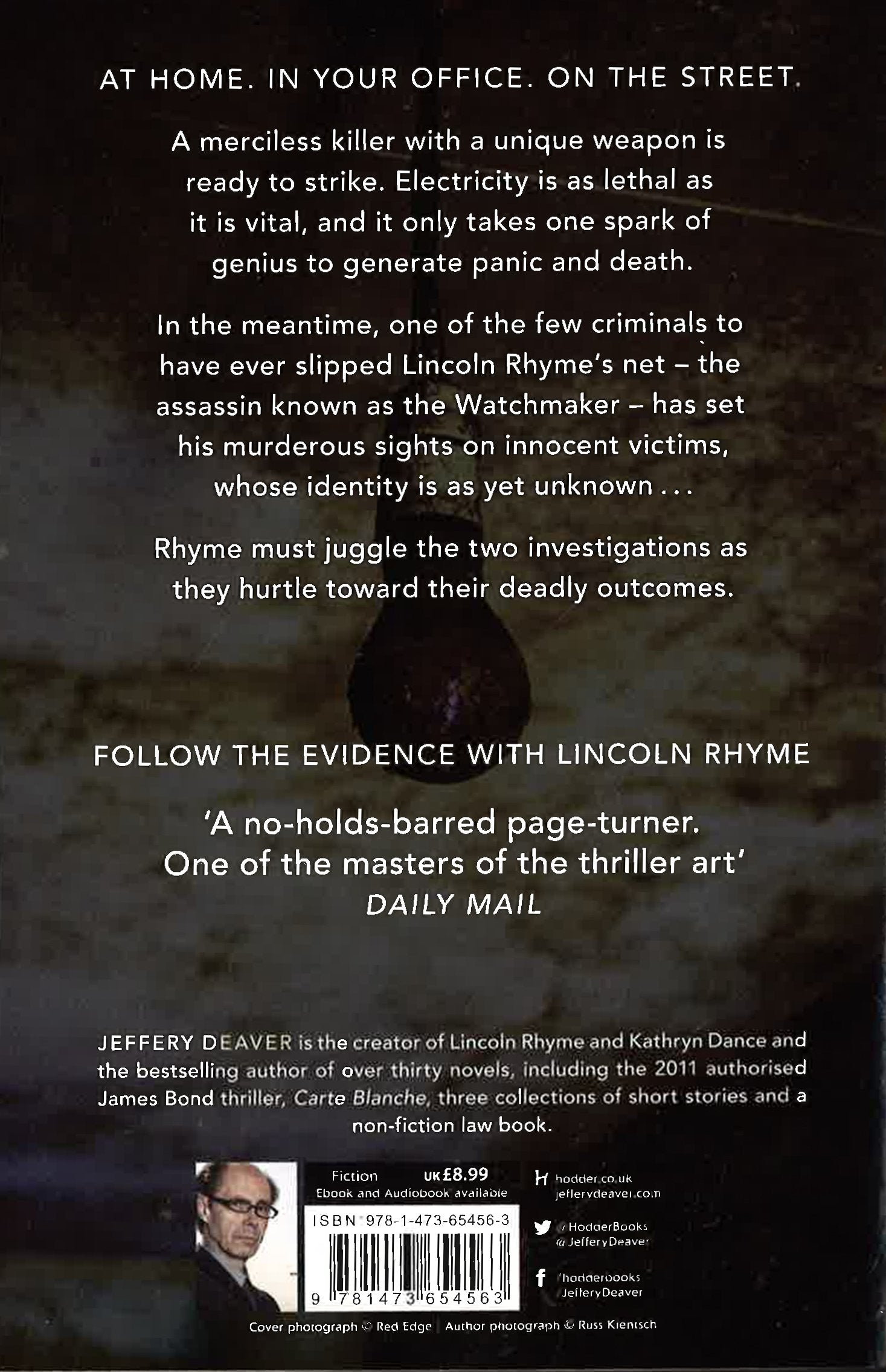 A Merciless killer with a unique weapon is ready to strike. Electricity is as it is vital, and it only takes one spark of genius to generate panic and death. In the meantime, one of the few criminals to have ever slipped Lincoln Rhyme's net the assassin known as the watchmaker has set hi murderous sights on innocent ictims, hose identity is yet unknown. Rhyme must juggle two investigations as they hurtle toward their deadly outcomes.