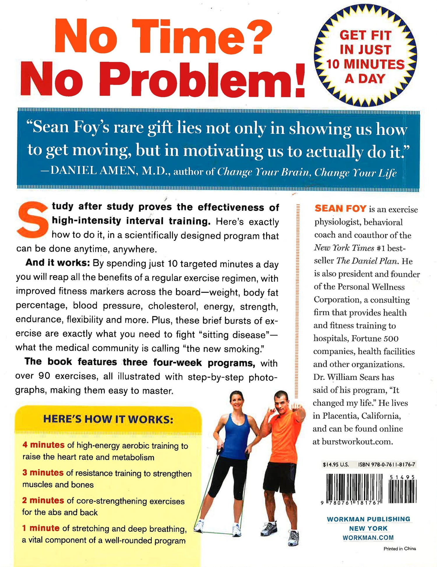 Here from Sean Foy--exercise physiologist and coauthor of the million-copy bestseller The Daniel Plan--is The Burst! Workout, a complete program for 10-minute interval and circuit workouts that can be done practically anywhere, anytime. Study after study proves the effectiveness of high-intensity interval training. Now, here's exactly how to do it: four minutes to raise the heart rate and metabolism; three minutes of resistance training to strengthen muscles and bones; two minutes of core movements for the abs and back; one minute of deep breathing and stretching (a vital component missing from other popular high intensity circuit programs). The book features three four-week programs: Level 1, with no equipment required, perfect for the office (and fighting the "sitting disease"); Level 2, with minimal equipment; and Level 3, which brings interval training to the gym. The simple, scientifically devised exercises are illustrated with step-by-step photographs and are easy to master. The results are astonishing: The workouts boost metabolic rate, promote weight loss, target all the major muscle groups, increase cardiovascular endurance, have a positive effect on cholesterol levels and blood pressure, and deliver a sense of well-being. All in just a few minutes a day.