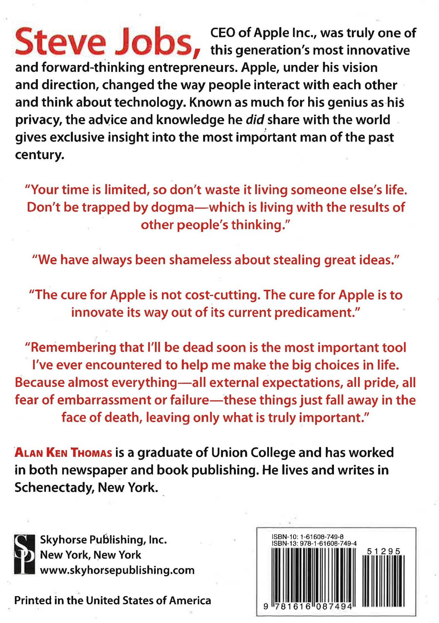 Lessons from America?s modern Edison - for everyone who wants to thrive in business or a creative field. Steve Jobs, CEO of Apple Inc., was truly one of this generation?s most innovative and forward-thinking entrepreneurs. Apple, under his vision and direction, changed the way people interact with each other and think about technology. Known as much for his genius as his privacy, the advice and knowledge he did share with the world gives exclusive insight into the most important man of the past century.